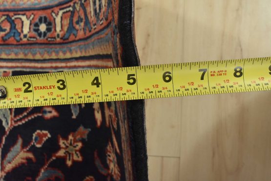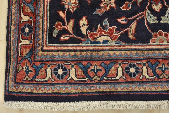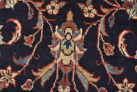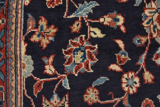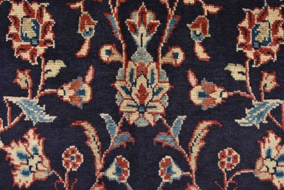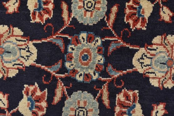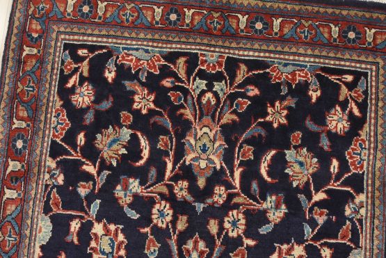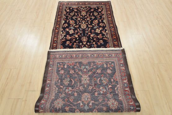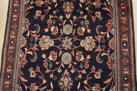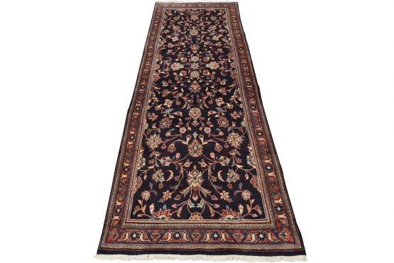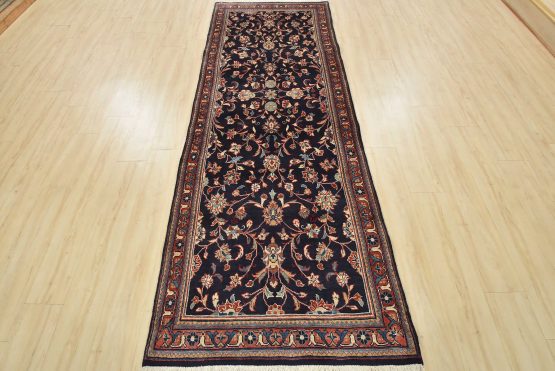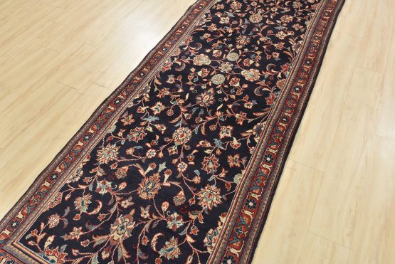 An authentic vintage traditional Sarouk runner hand-knotted with fine wool and natural dyes. This rug features an all-over floral design set against a dark blue background. It is in excellent shape for an older rug. It has a full wool pile with no worn areas and is in very good condition.