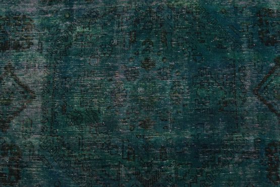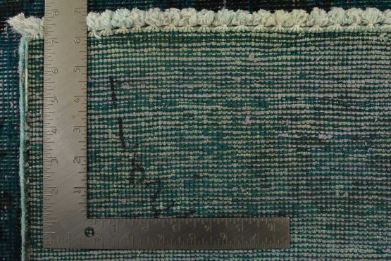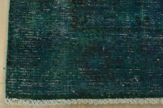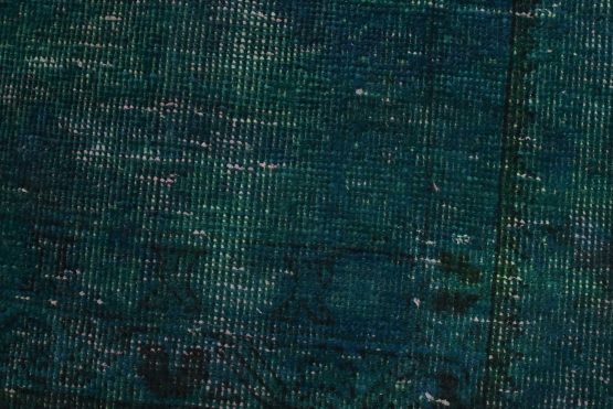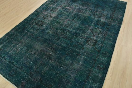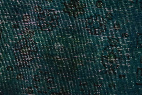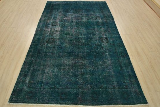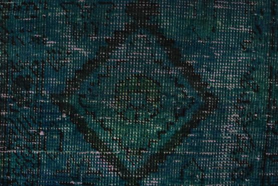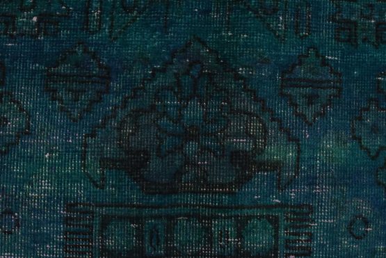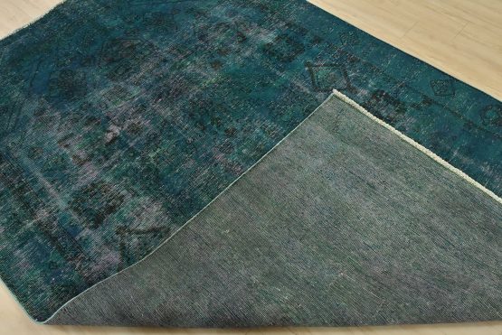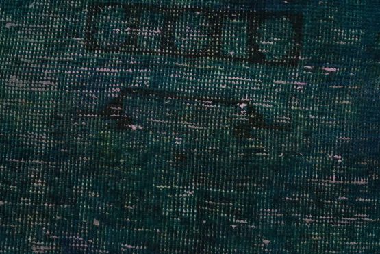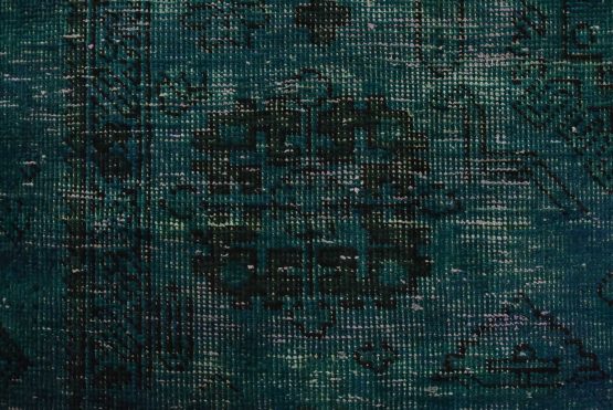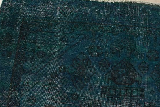 An authentic vintage traditional Overdyed Tabriz rug hand-knotted with an all-wool pile on a cotton foundation. This oriental rug features a muted central medallion surrounded by muted geometric motifs set against a blue background. It has a low wool pile, is worn and distressed, and has minor imperfections (see photos). However, it is in very good condition.