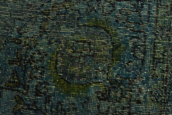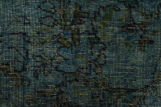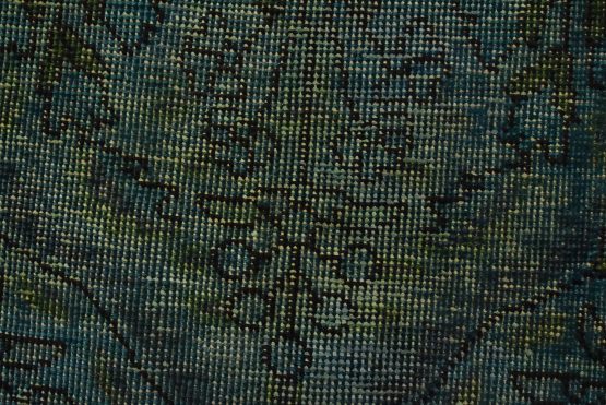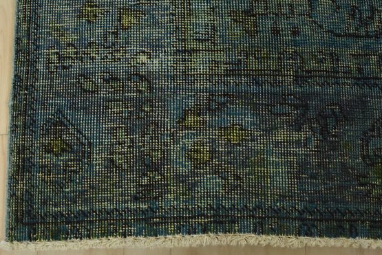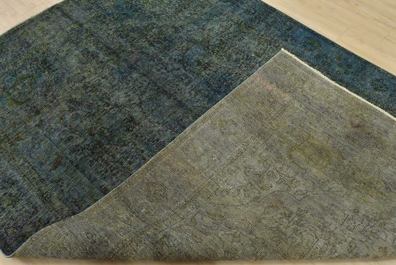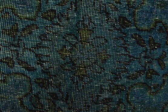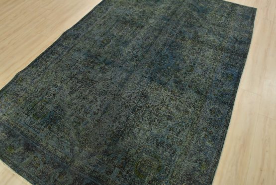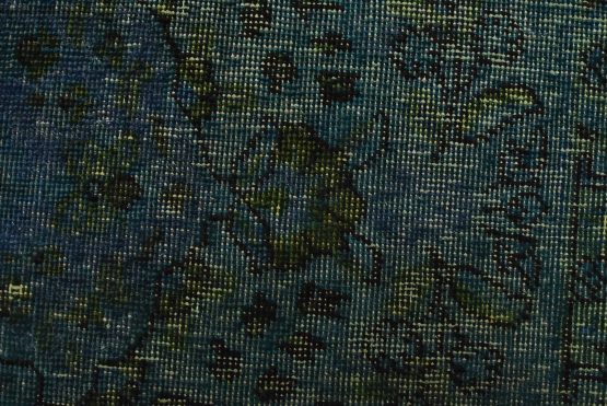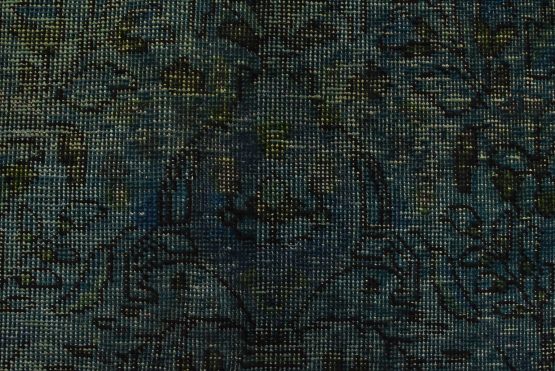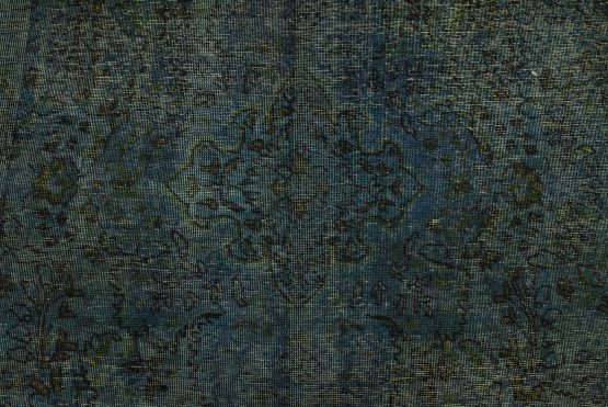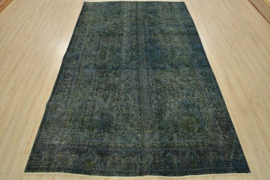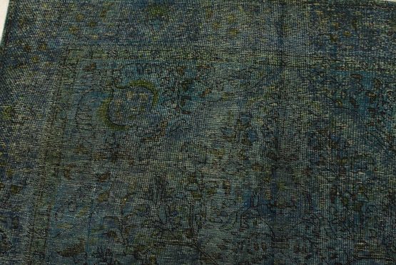 An authentic vintage traditional Overdyed Tabriz rug hand-knotted with an all-wool pile on a cotton foundation. This oriental rug features a muted central medallion surrounded by muted floral designs set against a blue background. It has a low wool pile, is worn and distressed, and has minor imperfections (see photos). However, it is in very good condition.