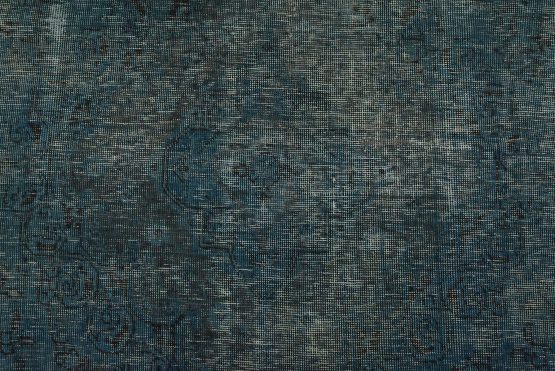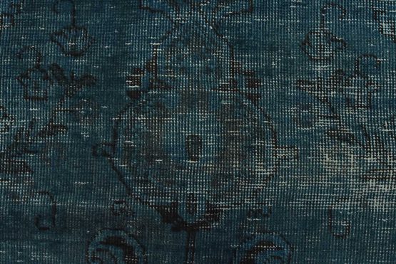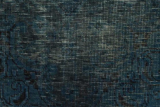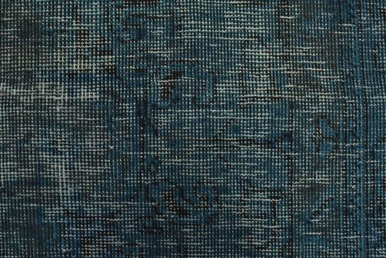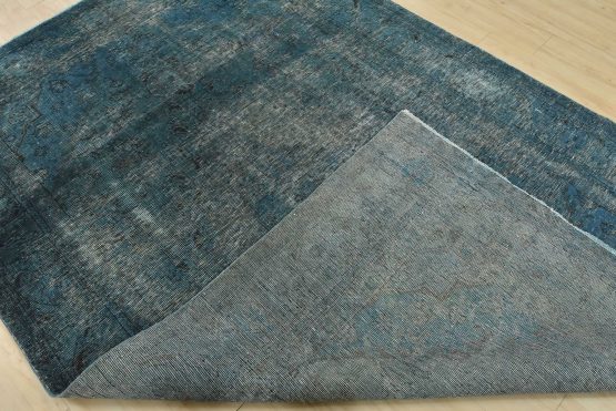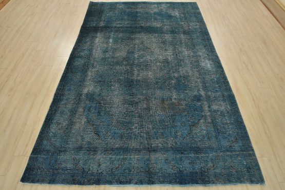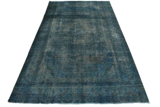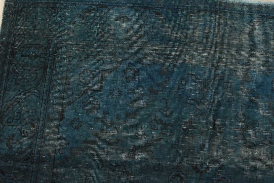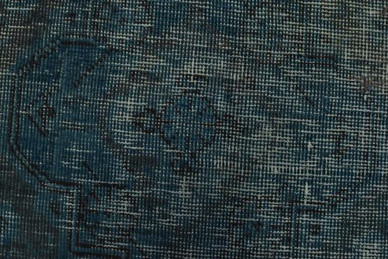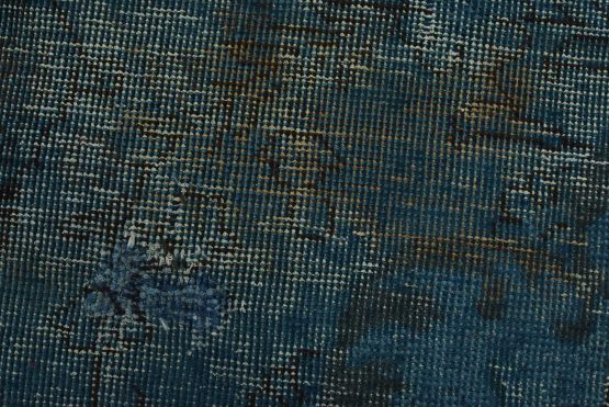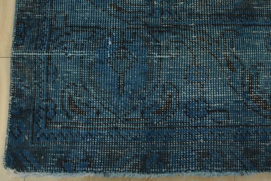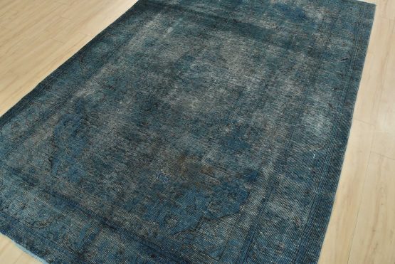 An authentic vintage traditional Overdyed Tabriz rug hand-knotted with an all-wool pile on a cotton foundation. This oriental rug features a muted central medallion surrounded by floral motifs set against a blue background. It has a low wool pile, is worn and distressed, with threadbare areas and minor imperfections (see photos). However, it is in very good condition.