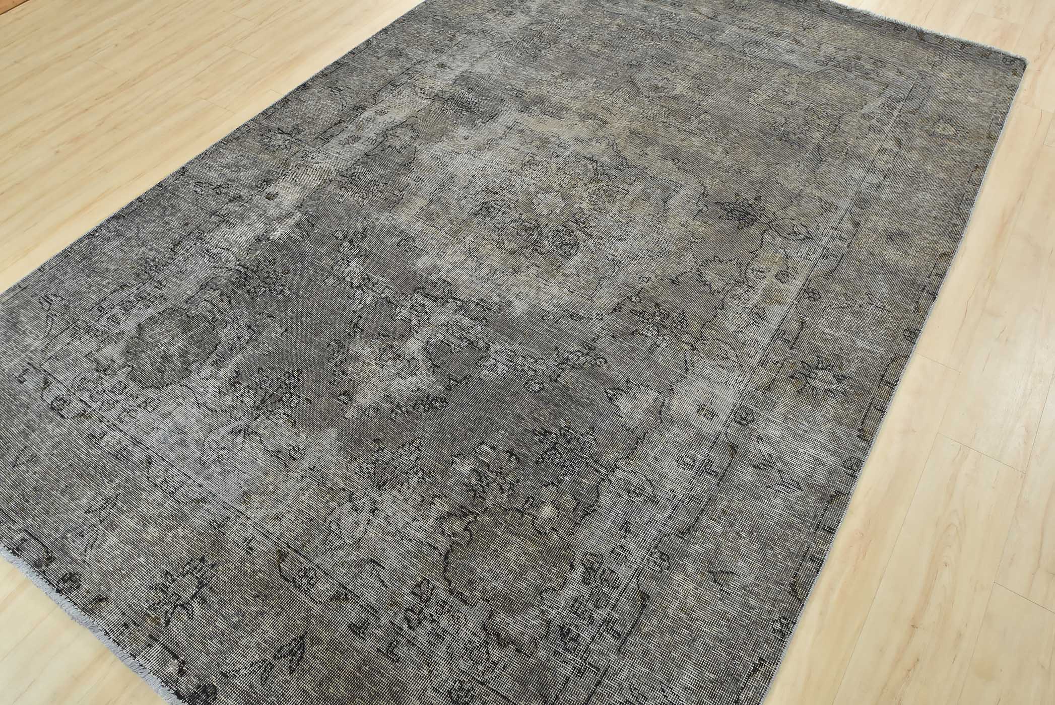 An authentic vintage traditional Overdyed Tabriz rug hand-knotted with an all-wool pile on a cotton foundation. This oriental rug features a muted central medallion surrounded by muted floral motifs set against a gray background. It has a low wool pile, is worn and distressed, and has minor imperfections (see photos). However, it is in very good condition.