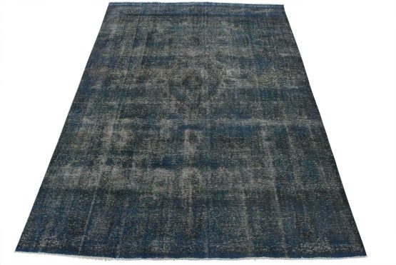 An authentic vintage traditional Overdyed Tabriz rug hand-knotted with an all-wool pile on a cotton foundation. This oriental rug features a muted central medallion surrounded by floral designs set against a blue background. It has a low wool pile, is worn and distressed, and has minor imperfections (see photos). However, it is in very good condition.