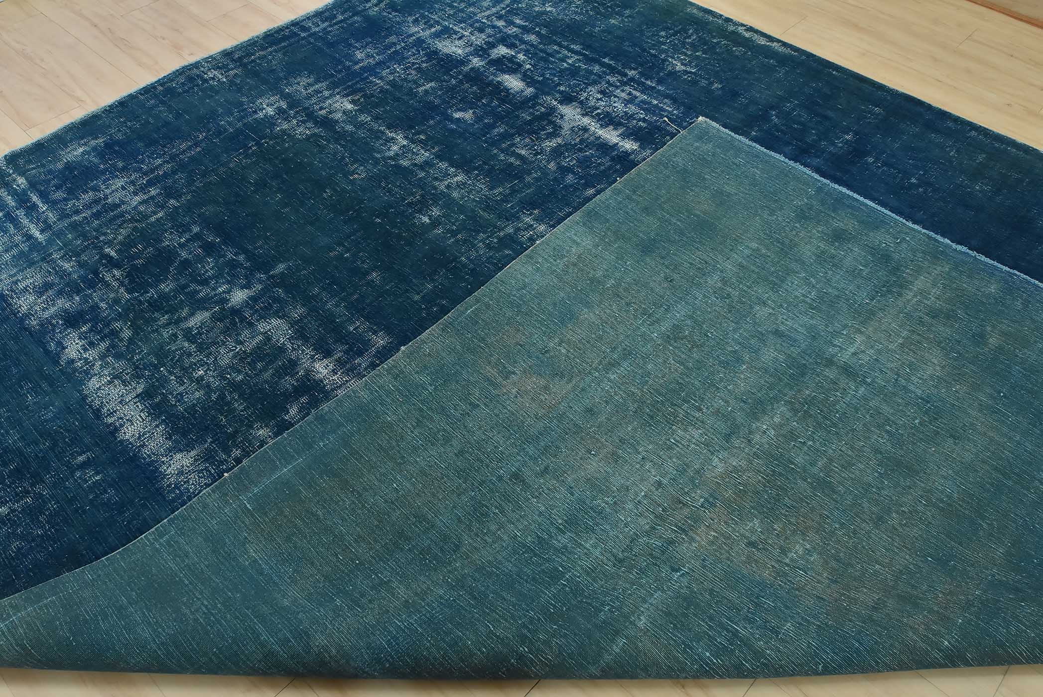 An authentic vintage Overdyed Tabriz rug hand-knotted with an all-wool pile on a cotton foundation. This oriental rug features a muted border with a distressed blue background. It has a low wool pile, is worn and distressed, with threadbare areas and minor imperfections (see photos). However, it is in very good condition.