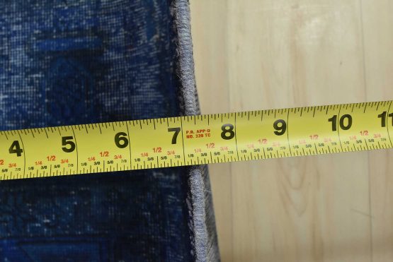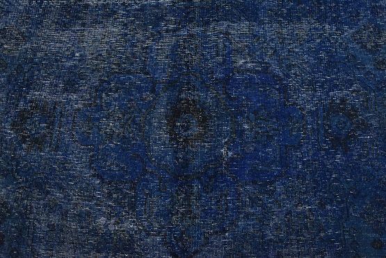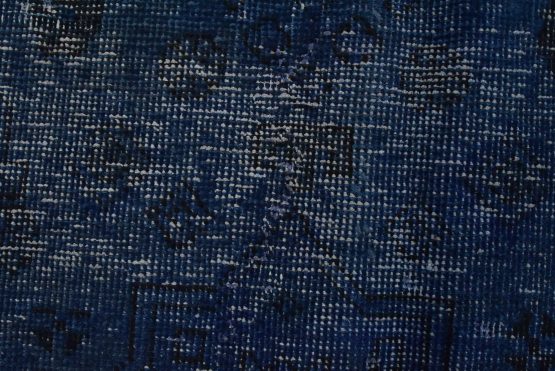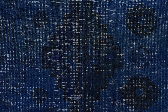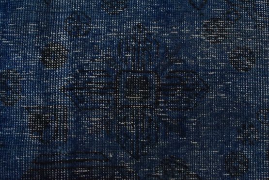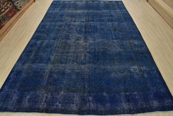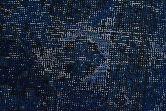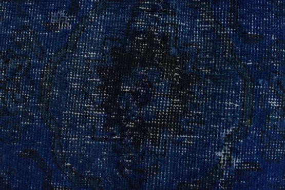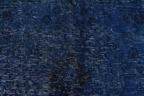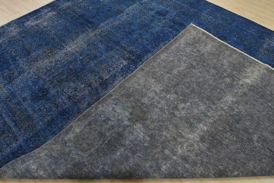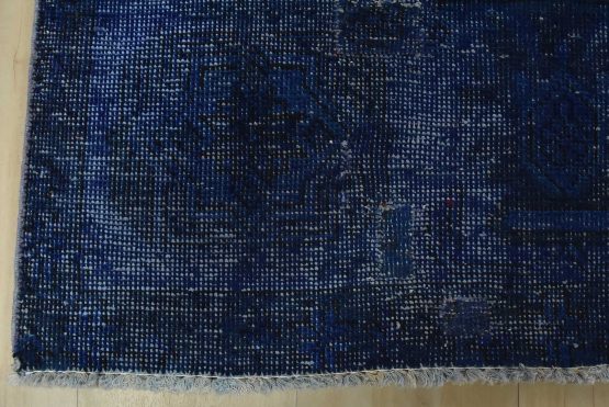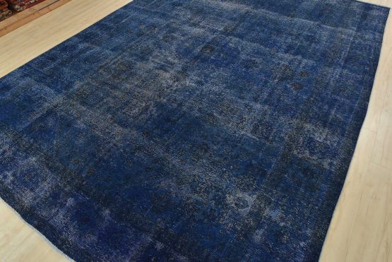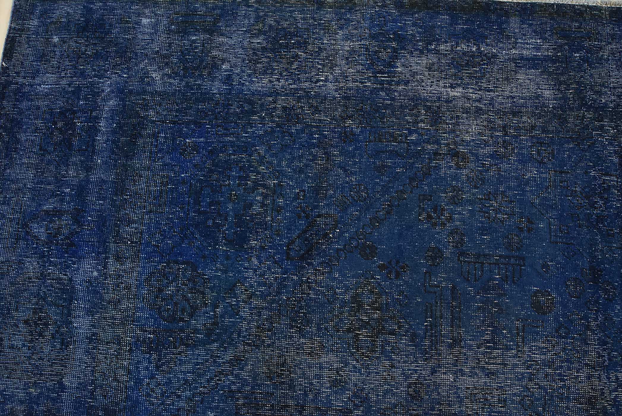 An authentic vintage traditional Overdyed Tabriz rug hand-knotted with an all-wool pile on a cotton foundation. This oriental rug features a muted central medallion surrounded by floral designs set against a blue background. It has a low wool pile, is worn and distressed, and has minor imperfections (see photos). However, it is in very good condition.