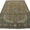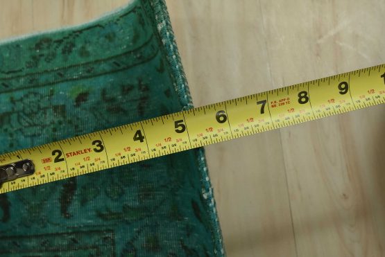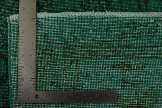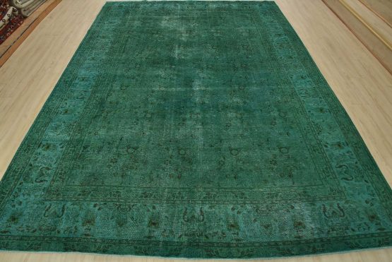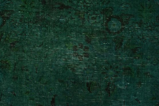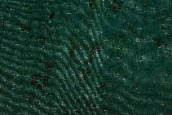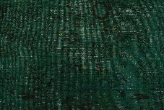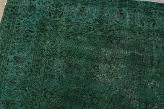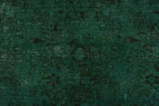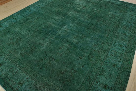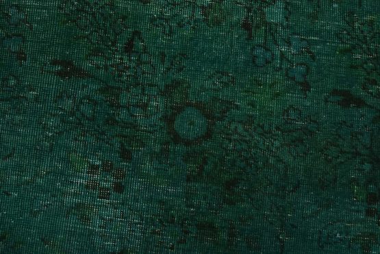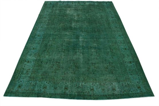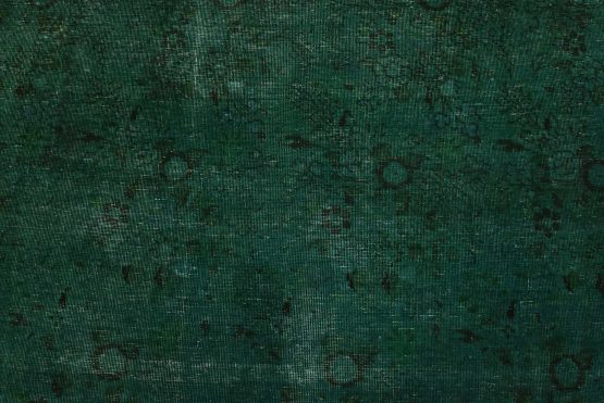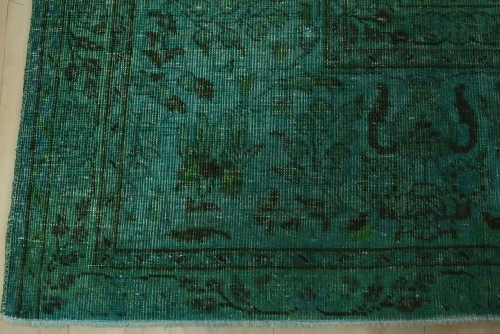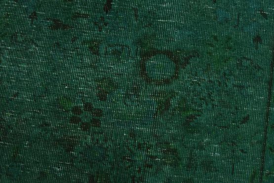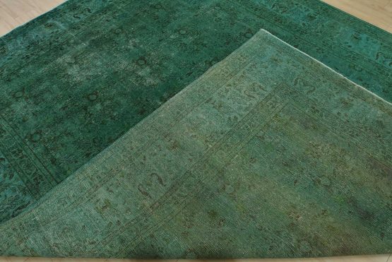 An authentic vintage traditional Overdyed Tabriz rug hand-knotted with an all-wool pile on a cotton foundation. This rug features a muted all-over floral pattern set against a green background. It has a low wool pile, is worn and distressed, and has minor imperfections (see photos). However, it is in very good condition.