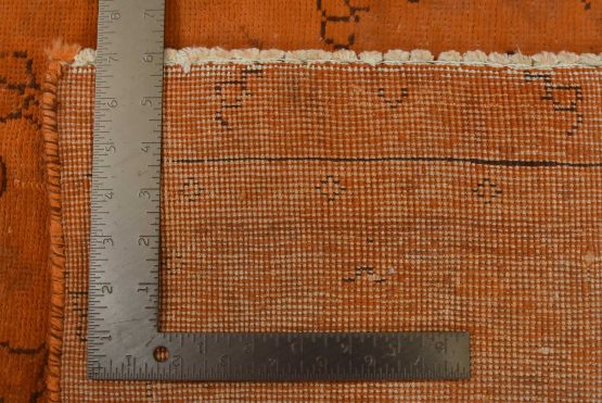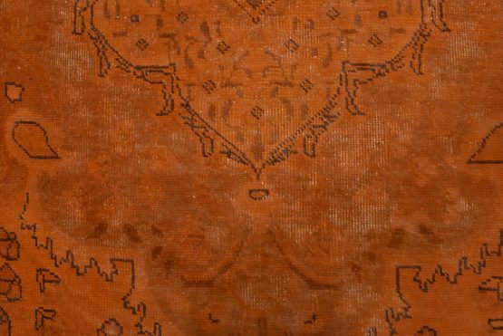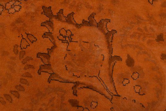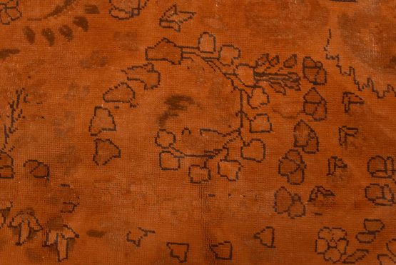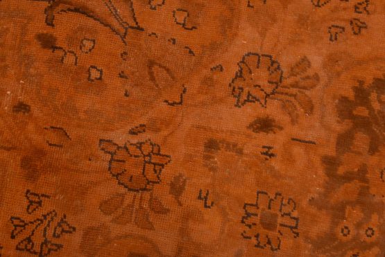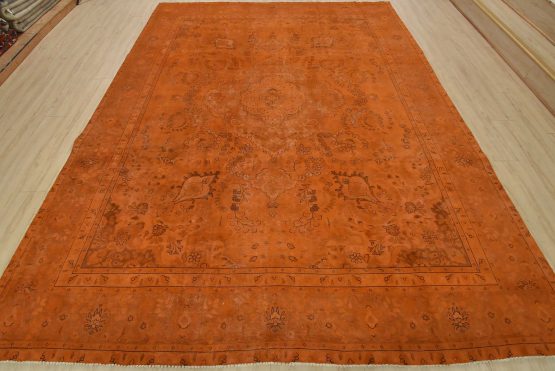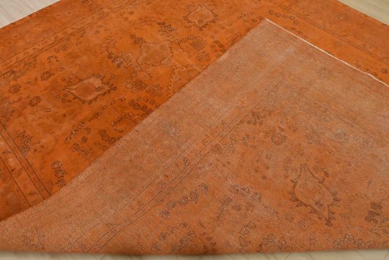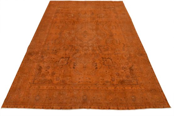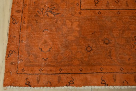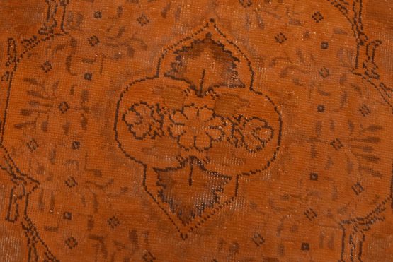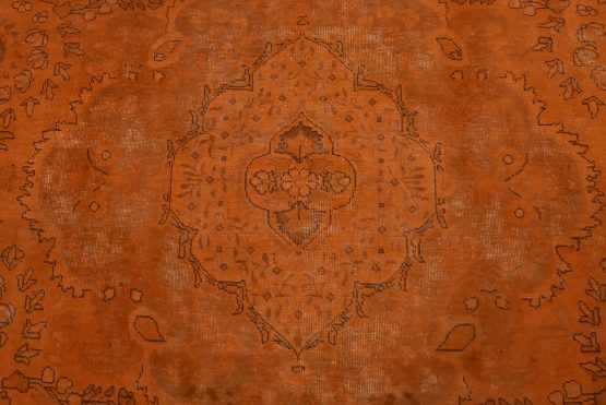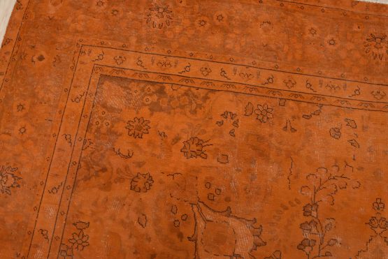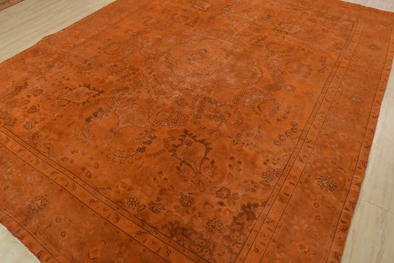 An authentic vintage traditional Overdyed Tabriz rug hand-knotted with an all-wool pile on a cotton foundation. This oriental rug features a muted central medallion surrounded by subtle floral designs set against an orange background. It has a low wool pile, is worn and distressed, and has minor imperfections (see photos). However, it is in very good condition.