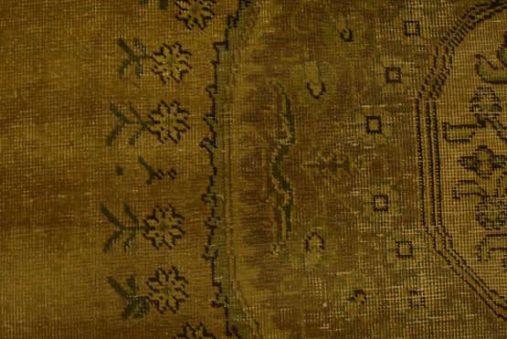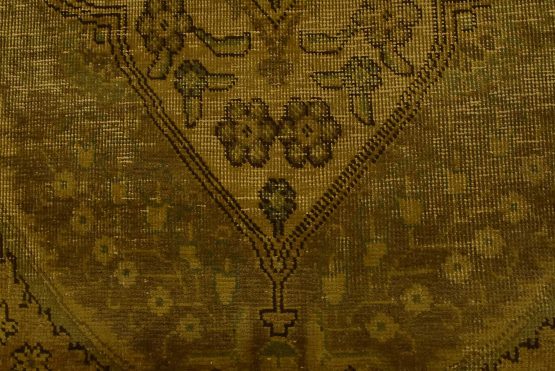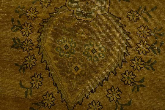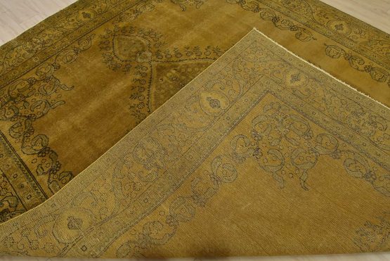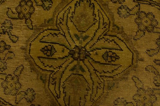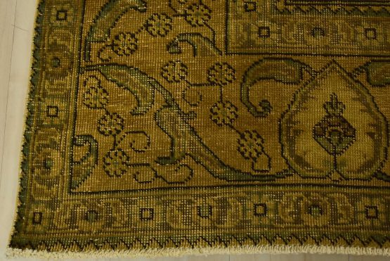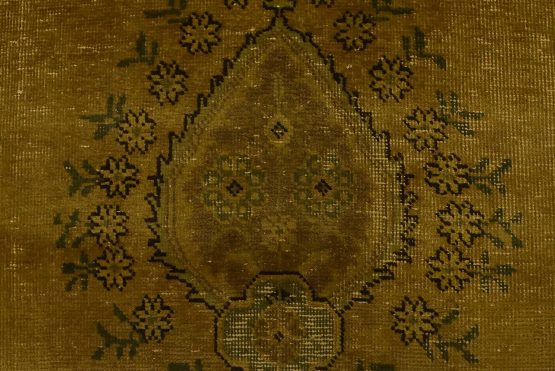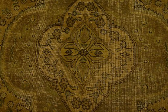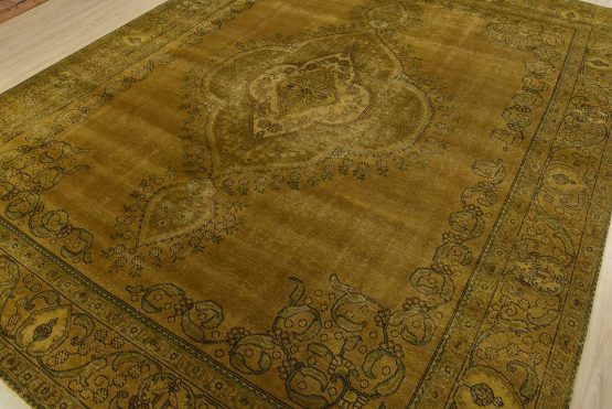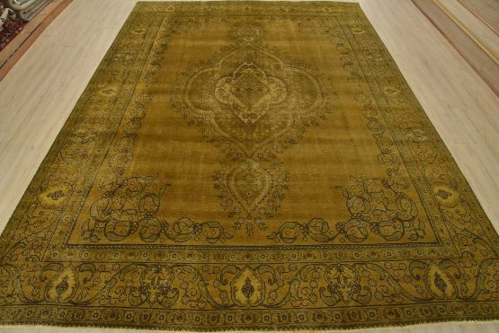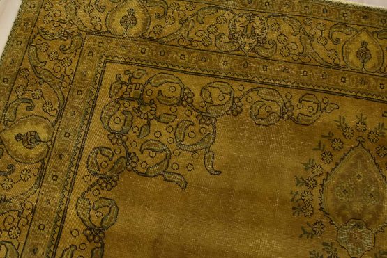 An authentic vintage traditional Overdyed Tabriz rug hand-knotted with an all-wool pile on a cotton foundation. This oriental rug features a large curvilinear medallion set against a gold background. It has a low wool pile, is worn, distressed, and has minor imperfections (see photos). However, it is in very good condition.