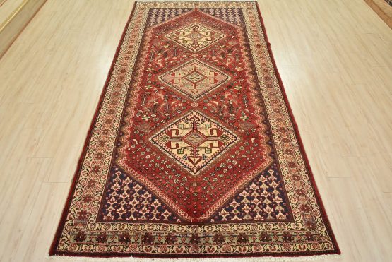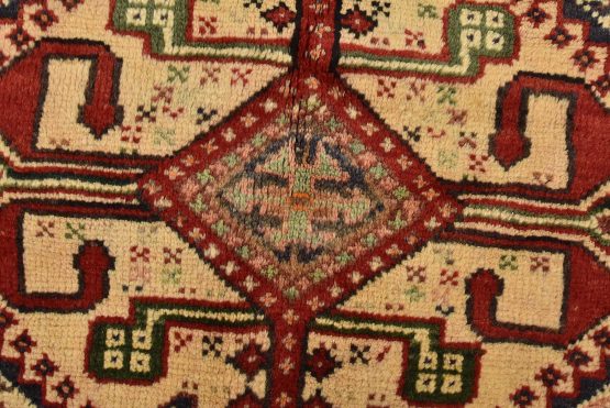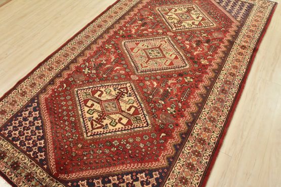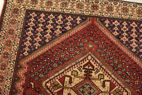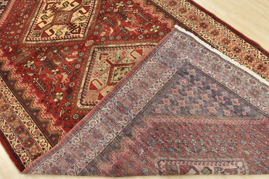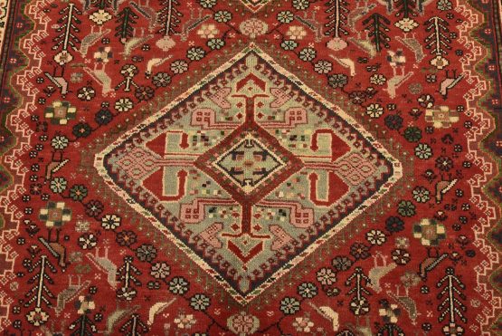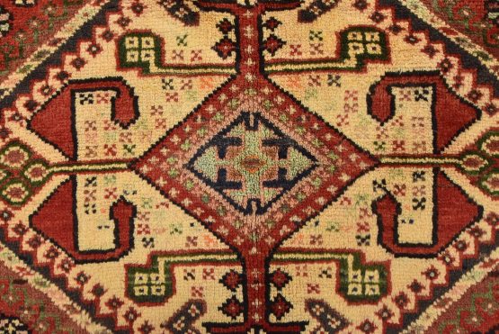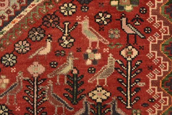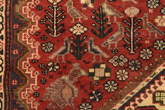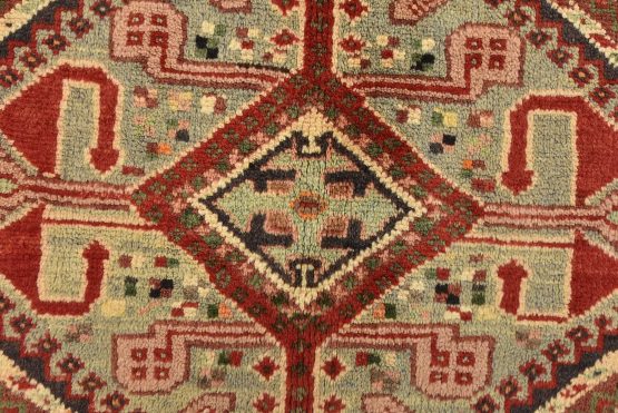 An authentic vintage tribal Qashqai rug hand-knotted with an all-wool pile on a cotton foundation. This nomadic oriental rug features a diamond-shaped medallion surrounded by bird figures, as well as other geometric floral motifs. It has a full wool pile with no worn areas and is in very good condition.
