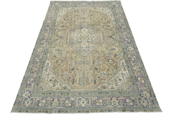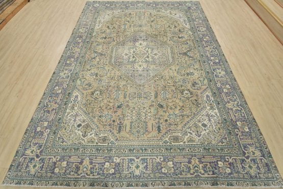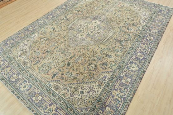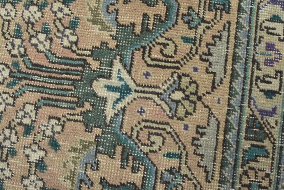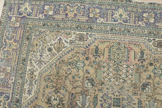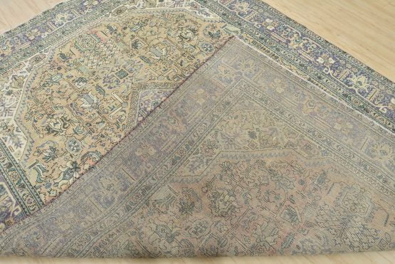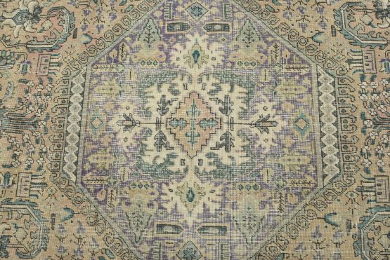 An authentic vintage traditional Tabriz rug hand-knotted with an all-wool pile on a cotton foundation. This oriental rug features a muted central geometric medallion surrounded by muted floral and botanical designs set against a pink background. It has a low wool pile, is worn and distressed, and has minor imperfections (see photos). However, it is in very good condition.