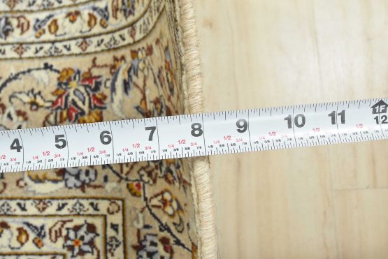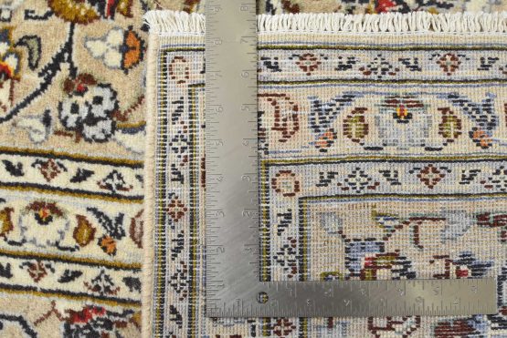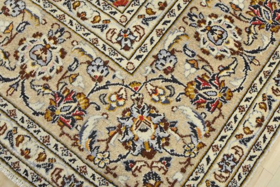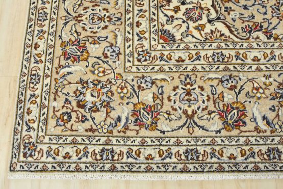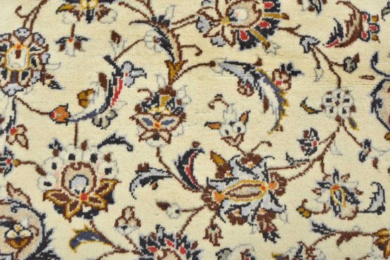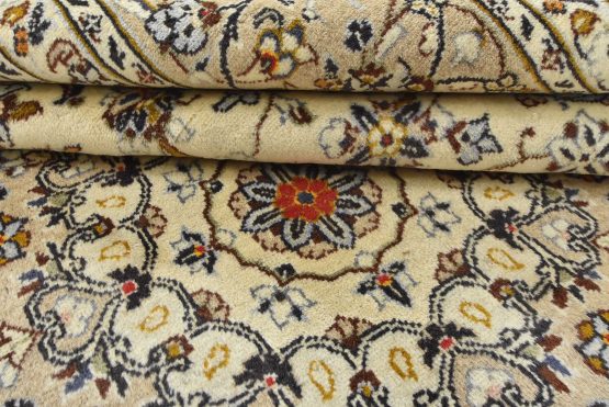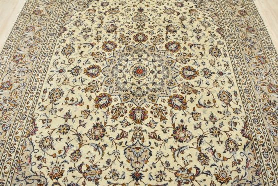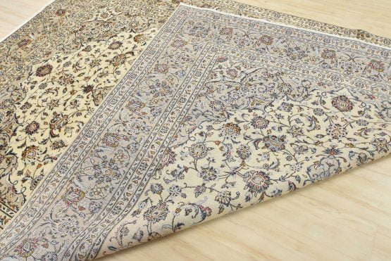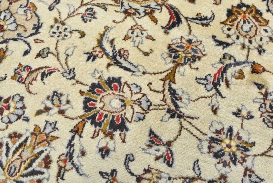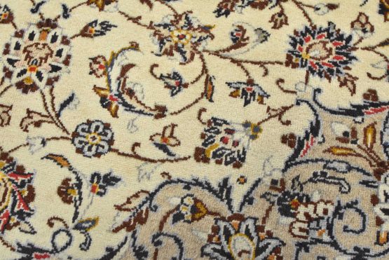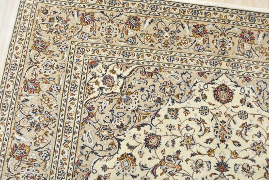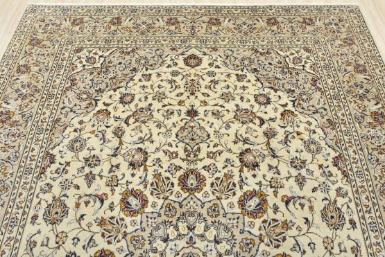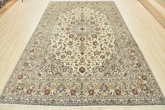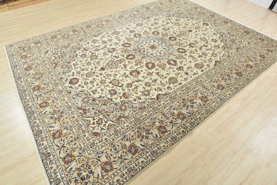 An authentic vintage traditional Kashan rug hand-knotted with fine wool and natural dyes. This oriental rug features a central medallion surrounded by a floral design set against an ivory background. It has a full wool pile with no worn areas and is in very good condition.