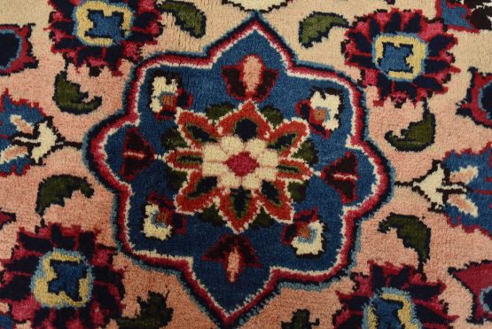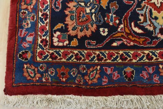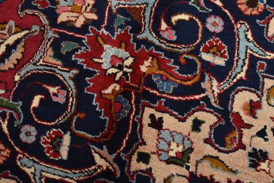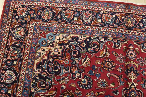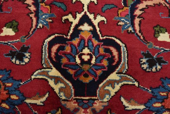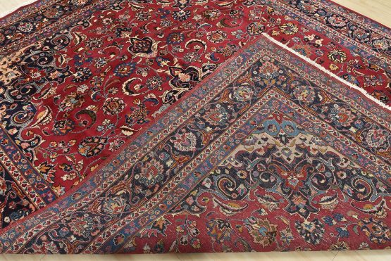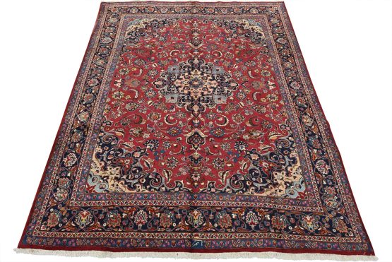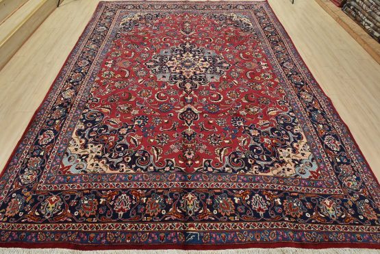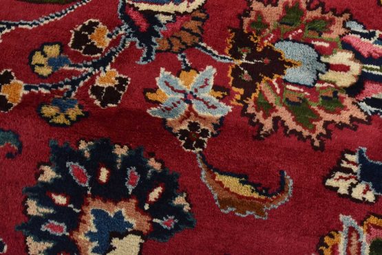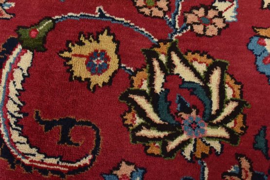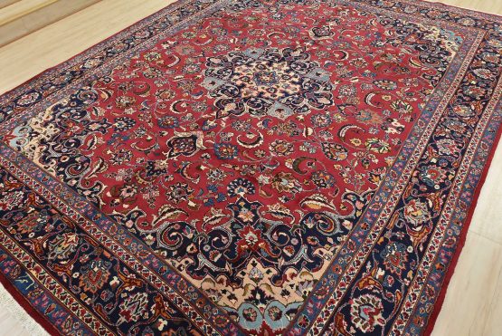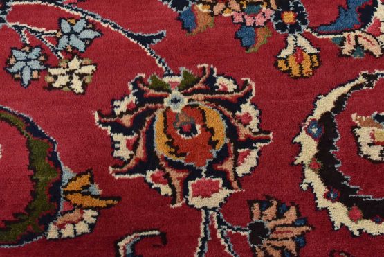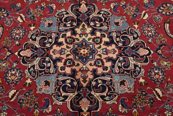 An authentic semi-antique traditional Mashad rug hand-knotted with fine wool and natural dyes. The oriental rug features a central medallion surrounded by a floral design set against a red background. It has a full wool pile with minor wear on the edge; see photos. Otherwise, the rug is in very good condition.