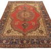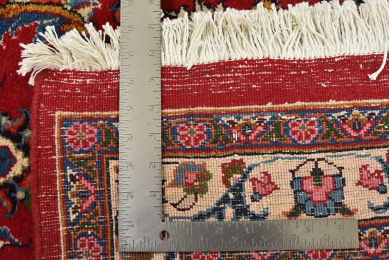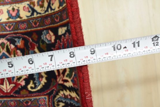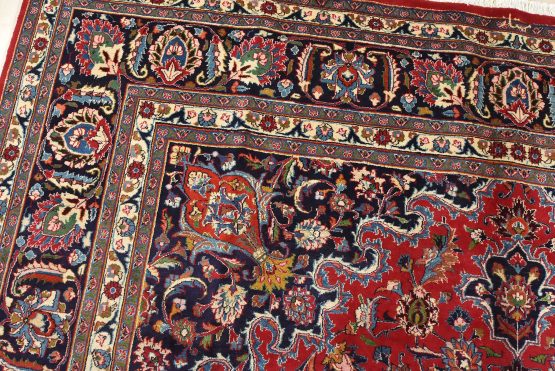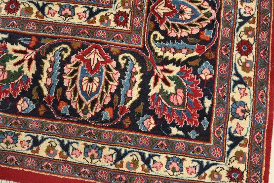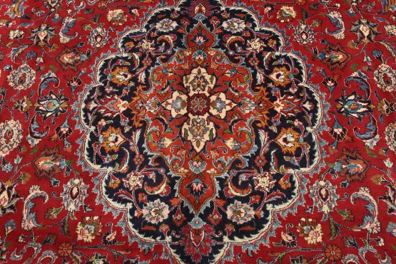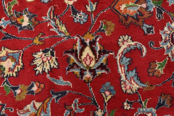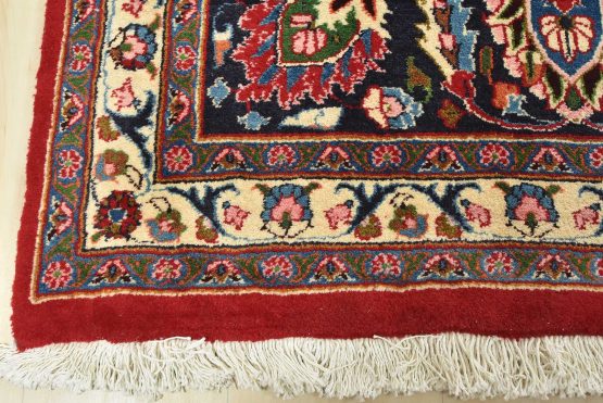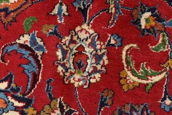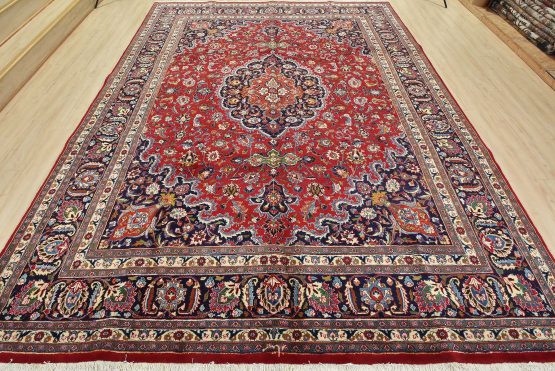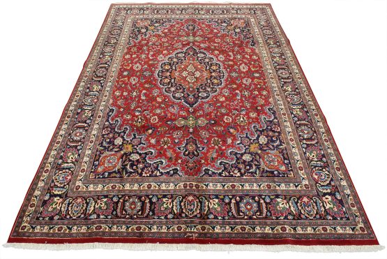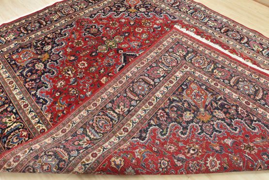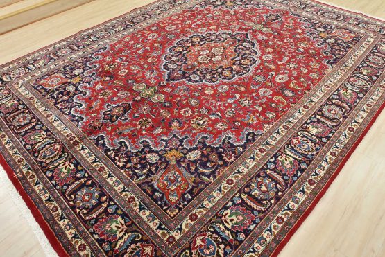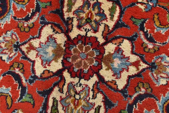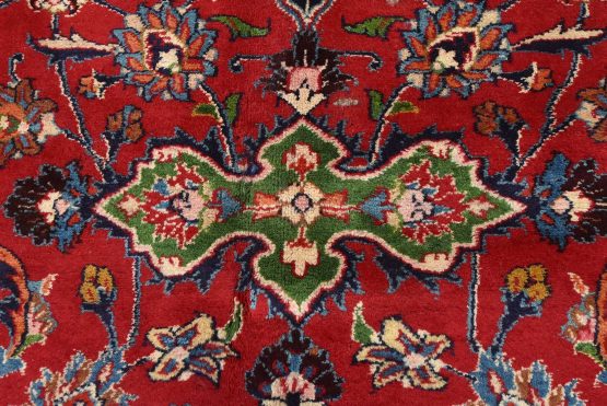 An authentic vintage traditional Mashad rug hand-knotted with fine wool and natural dyes. This oriental rug features a central medallion surrounded by floral designs set against a red background. It has a full wool pile with no worn areas and is in very good condition.
