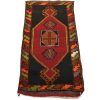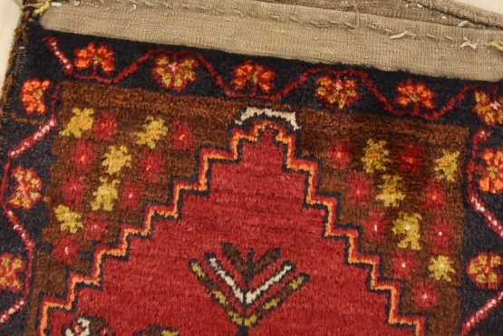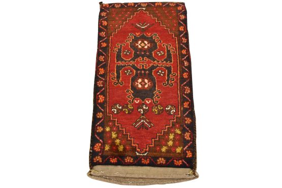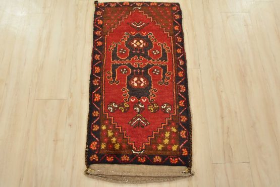 An authentic vintage tribal Malatya rug bag hand-knotted with fine wool and natural dyes. This nomadic oriental rug features a central medallion set against a red background. It has a full wool pile with no worn areas and is in very good condition.