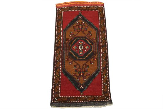 An authentic vintage tribal Malatya rug hand-knotted with fine wool and natural dyes. This nomadic oriental rug features a geometric central medallion set against a red background. It has a full wool pile with no worn areas and is in very good condition.