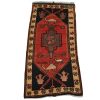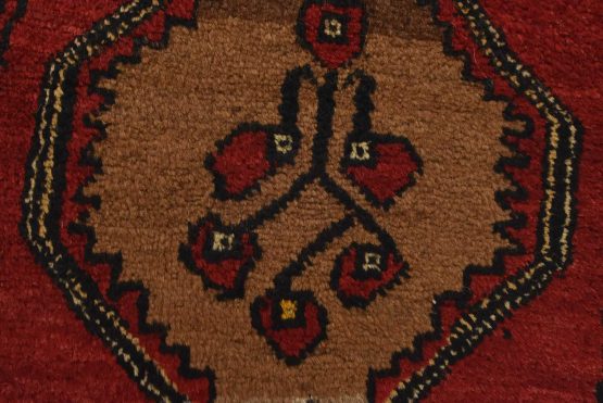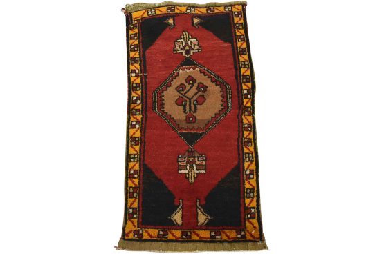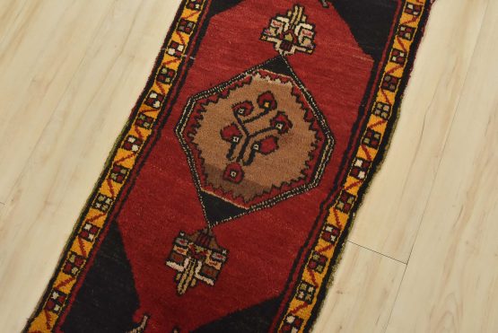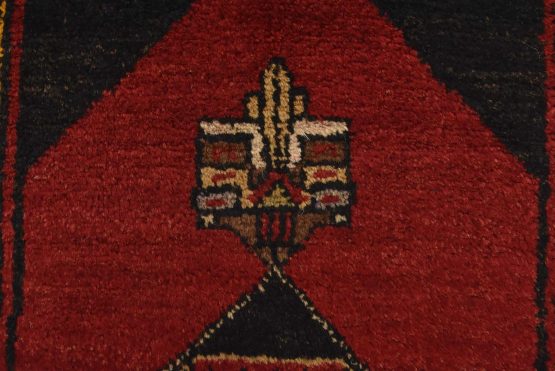 An authentic vintage tribal Malatya rug hand-knotted with fine wool and natural dyes. This nomadic oriental rug features a central geometric medallion set against a red background. It has a full wool pile with no worn areas and is in very good condition.