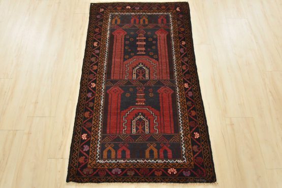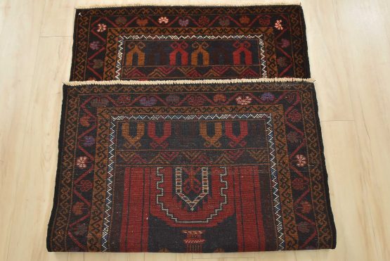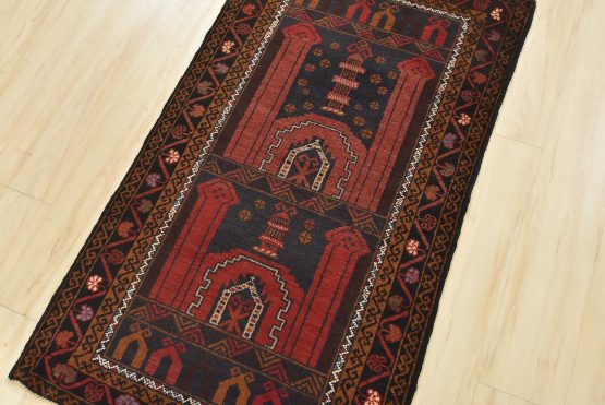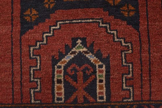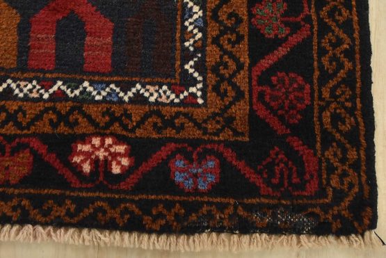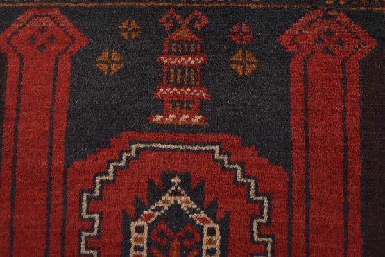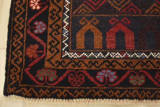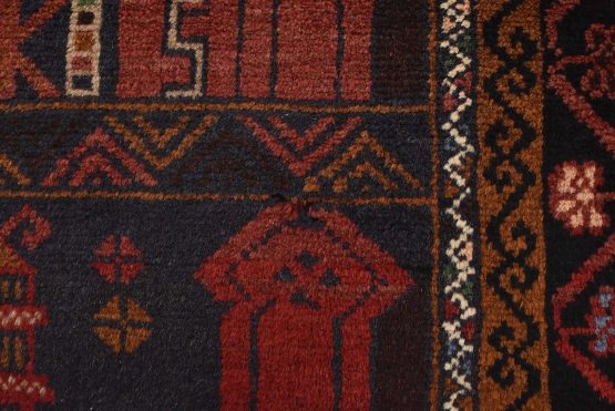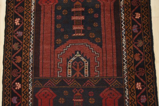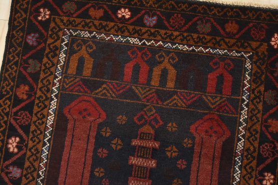 An authentic vintage tribal Baloch rug hand-knotted with fine wool and natural dyes. This nomadic oriental rug features two geometric Mosques set against a dark blue background. The wool pile shows some minor wear; please refer to the photos. Otherwise, the rug is in very good condition.