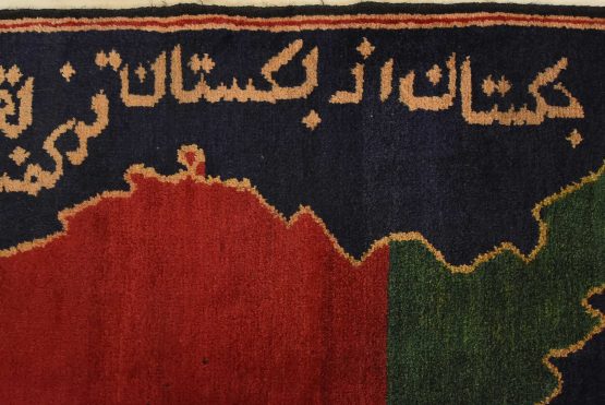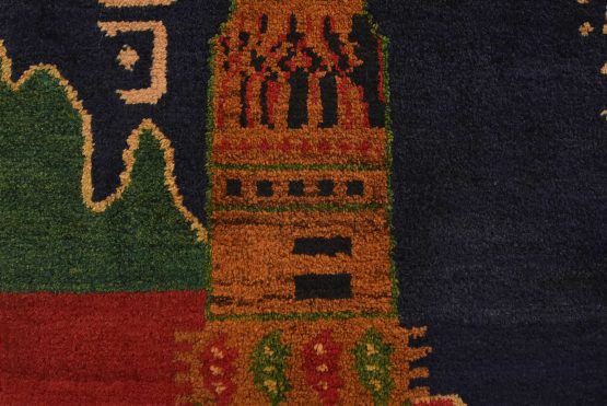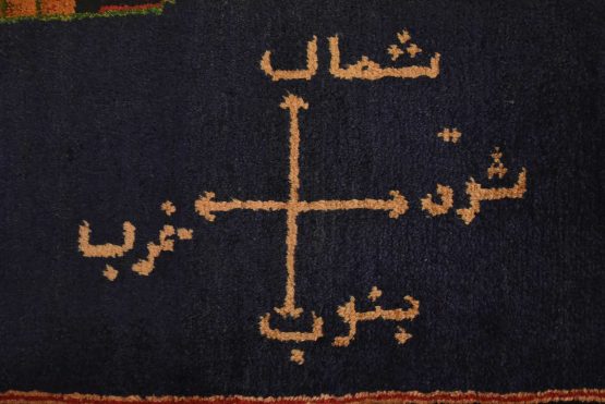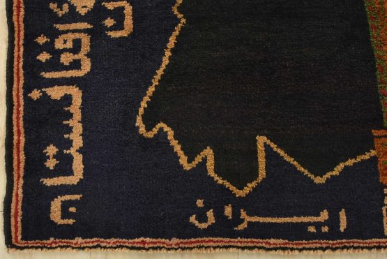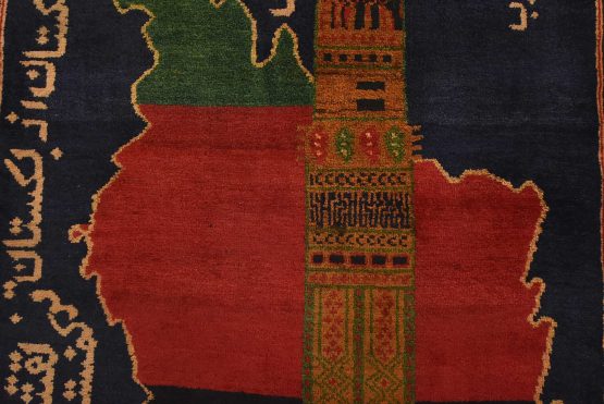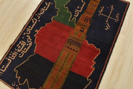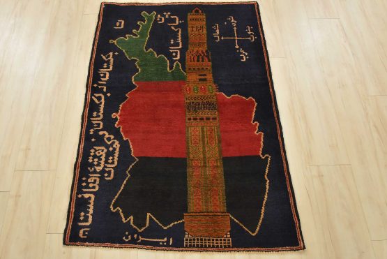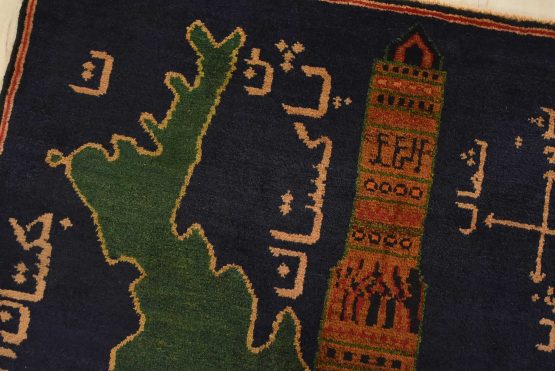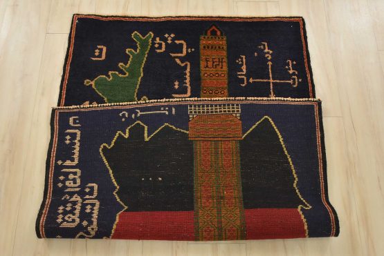An authentic vintage tribal Baloch rug hand-knotted with fine wool and natural dyes. This nomadic oriental rug features the country of Afghanistan with a geometric minaret set against a dark blue background. It has a full wool pile with no worn areas and is in very good condition.