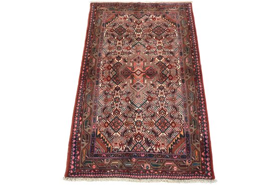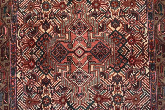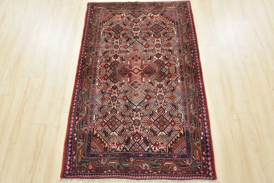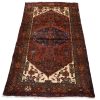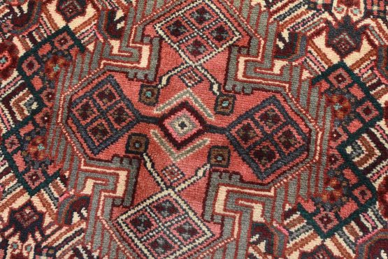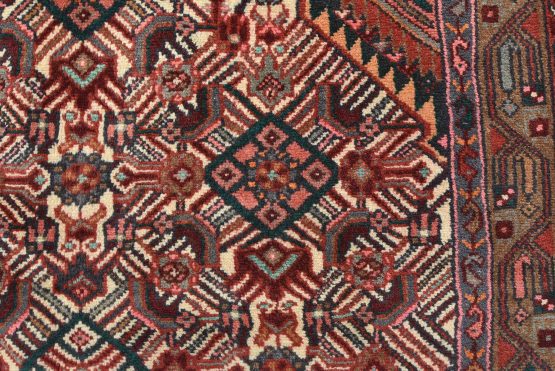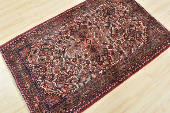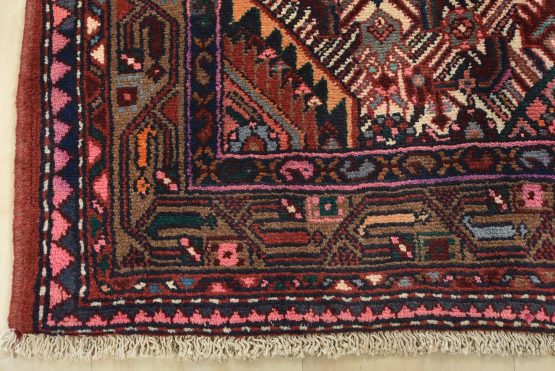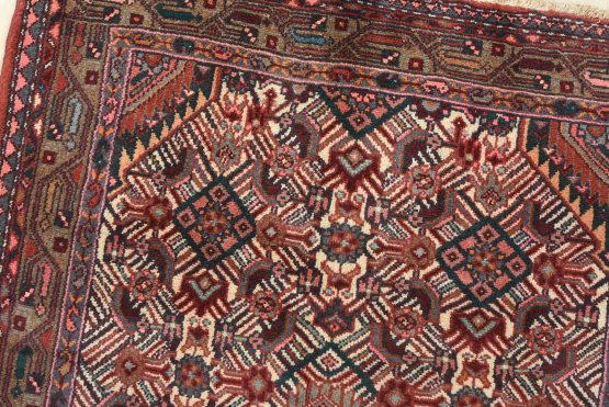 An authentic vintage tribal Hamedan rug hand-knotted with fine wool and natural dyes. This nomadic oriental rug features a central geometric medallion surrounded by a Herati pattern set against an ivory background. It has a full wool pile with no worn areas and is in very good condition.