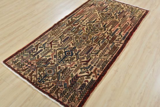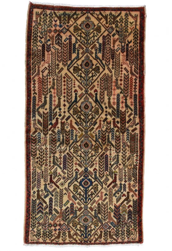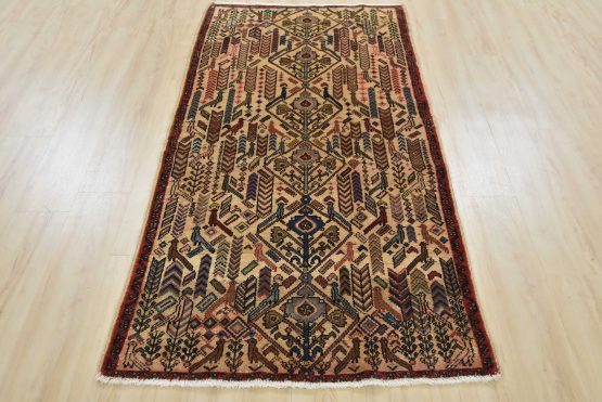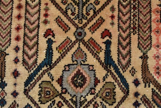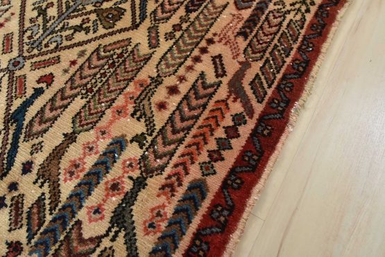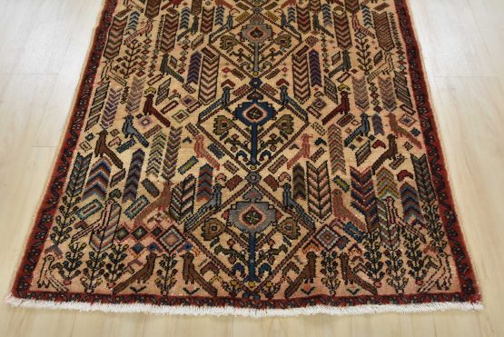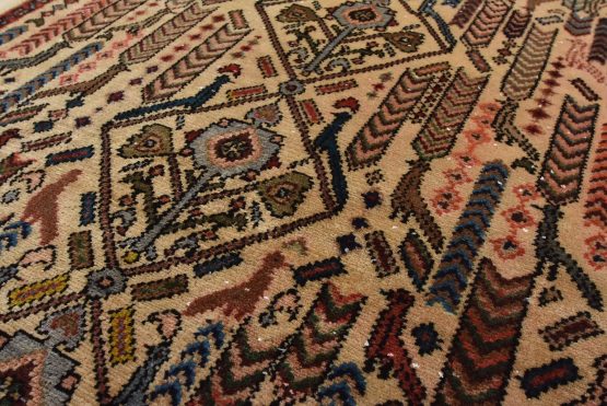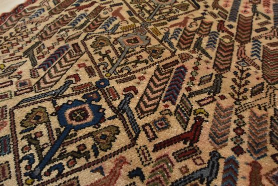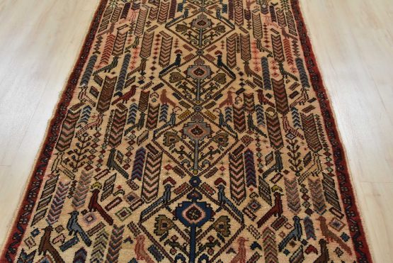 An authentic semi-antique tribal Hamedan rug hand-knotted with fine wool and natural dyes. This nomadic oriental rug features a geometric design adorned with birds on an ivory background. The wool pile shows minor wear, and some of the dyes have bled; please refer to the photos. Otherwise, the rug is in very good condition.