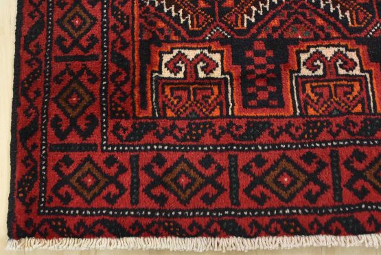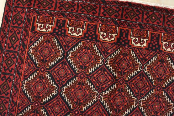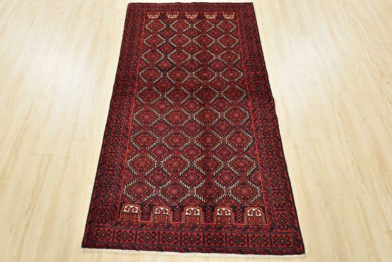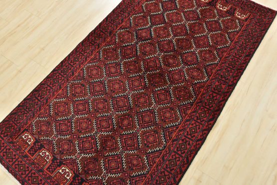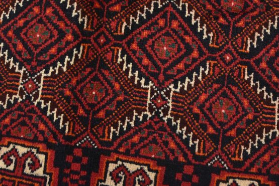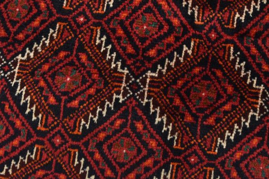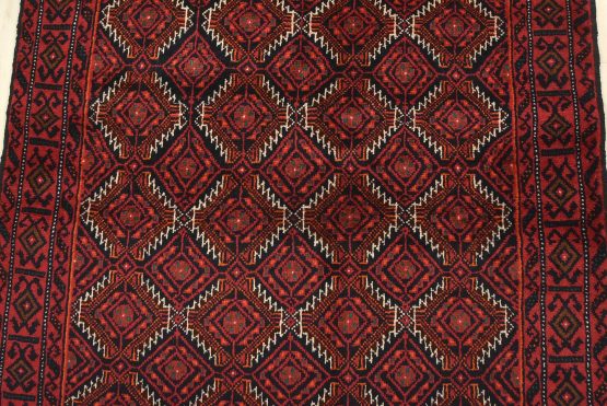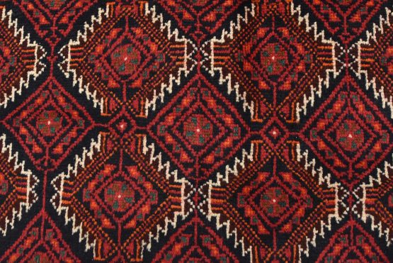 An authentic vintage tribal Baloch rug hand-knotted with fine wool and natural dyes. This nomadic oriental rug features an all-over geometric pattern set against a dark blue background. It has a full wool pile with no worn areas and is in very good condition.