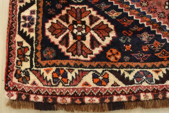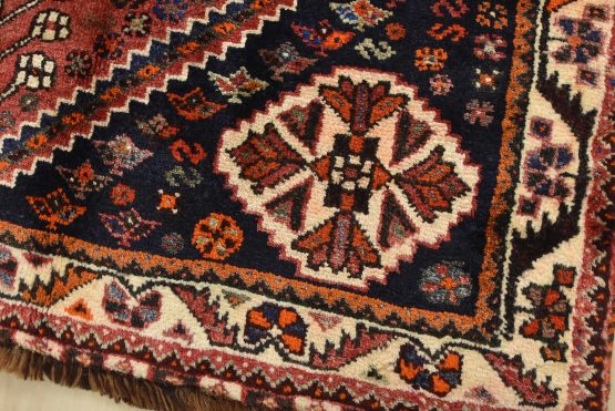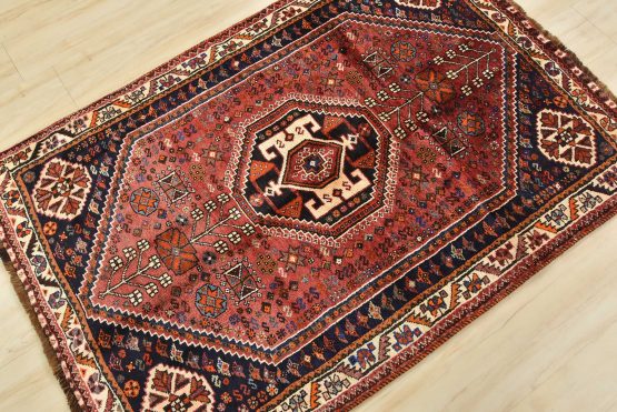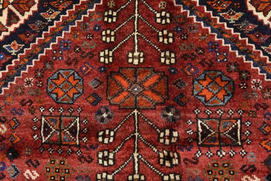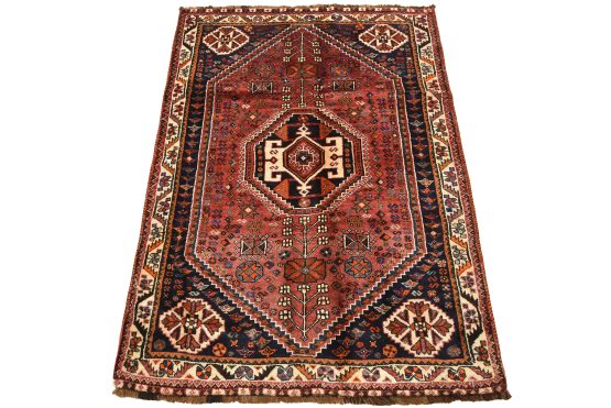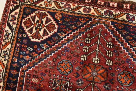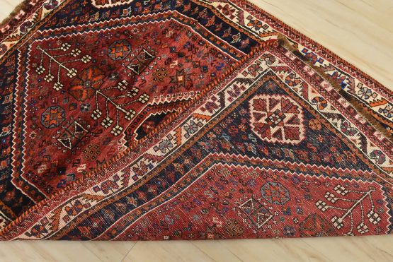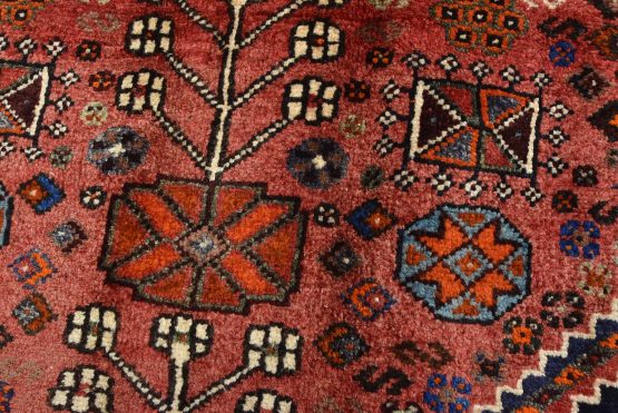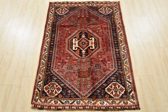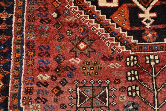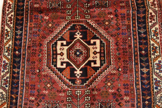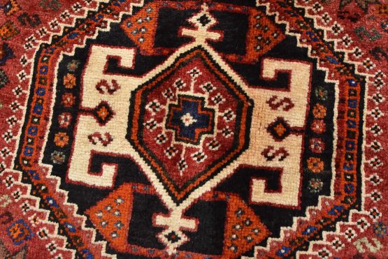 An authentic vintage tribal Qashqai rug hand-knotted with fine wool and natural dyes. This nomadic oriental rug features a central geometric medallion surrounded by small geometric motifs set against a red background. It has a full wool pile with no worn areas and is in very good condition.