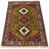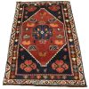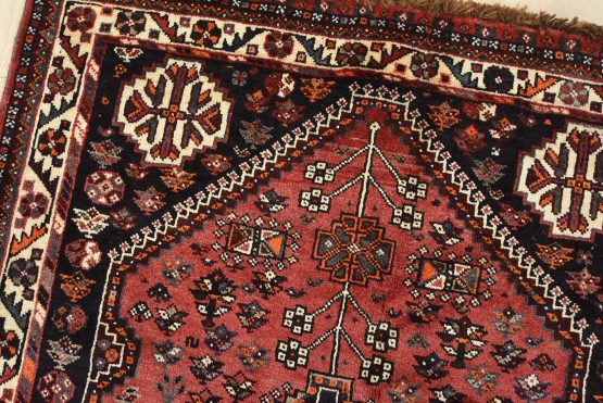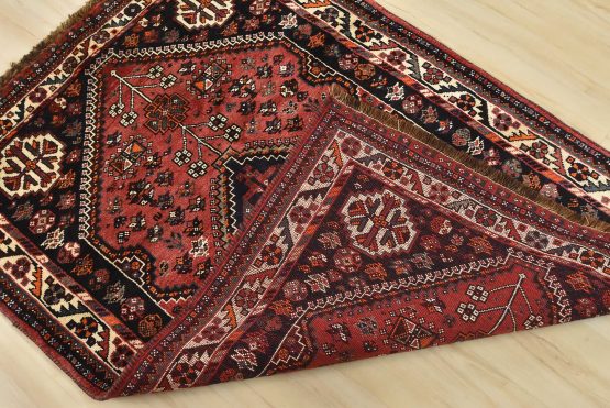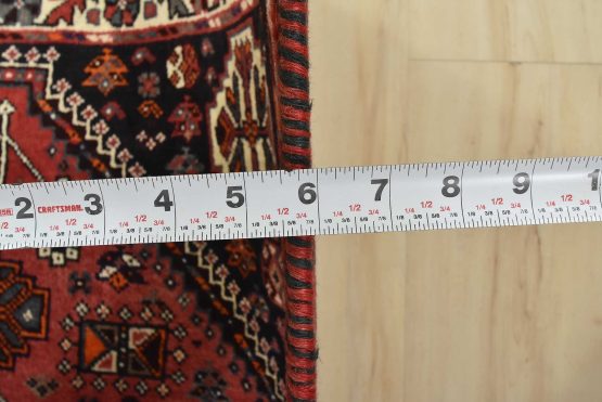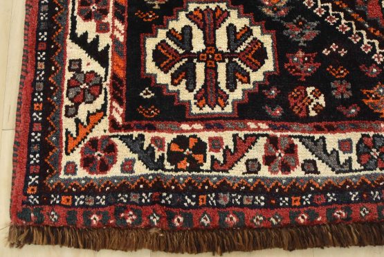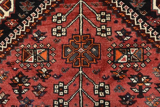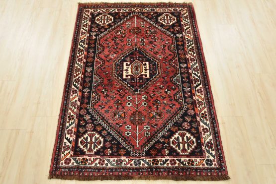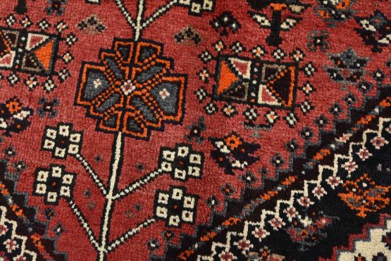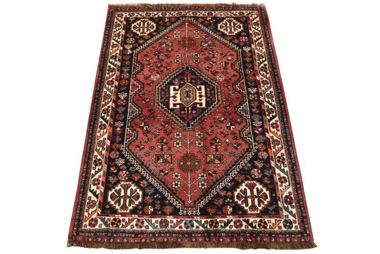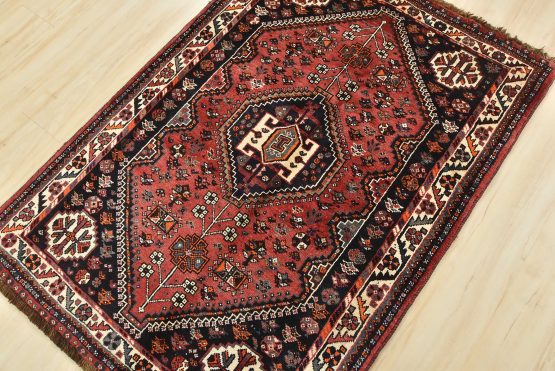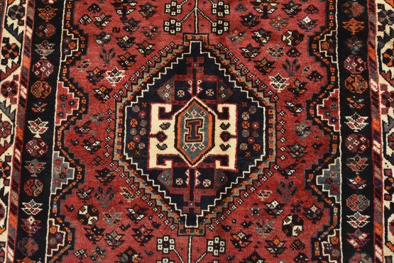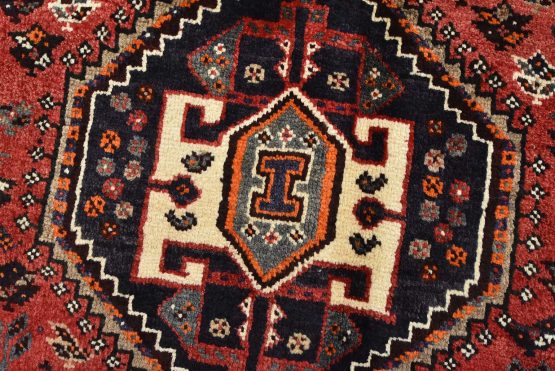 An authentic vintage tribal Qashqai rug hand-knotted with fine wool and natural dyes. This nomadic oriental rug features a central geometric medallion surrounded by geometric motifs set against a red background. It has a full wool pile with no worn areas and is in very good condition.