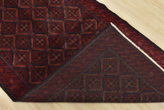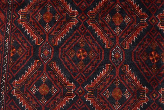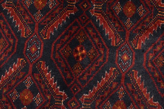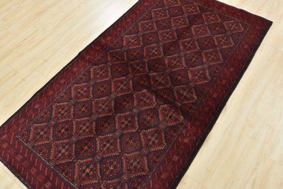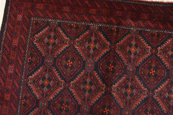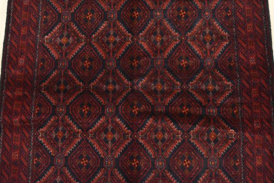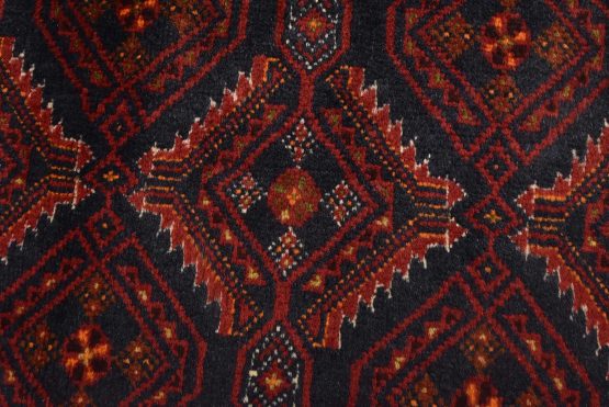 An authentic vintage tribal Baloch rug hand-knotted with fine wool and natural dyes. This nomadic oriental rug features an all-over geometric pattern set against a dark blue background. It has a full wool pile with no worn areas and is in very good condition.