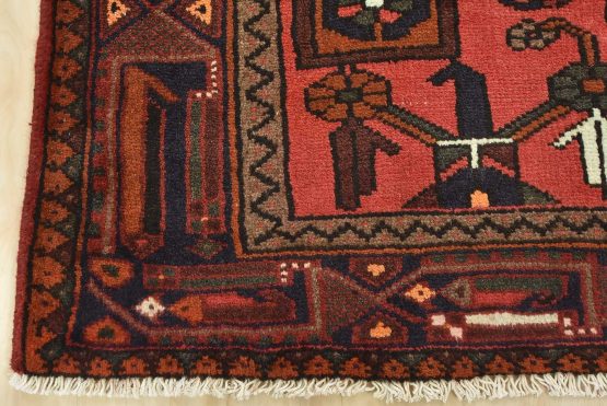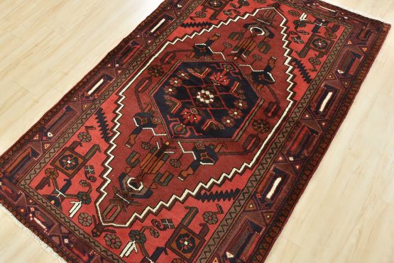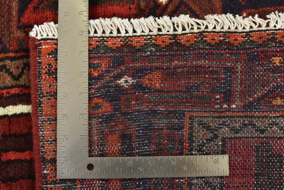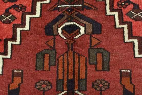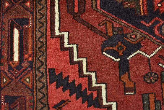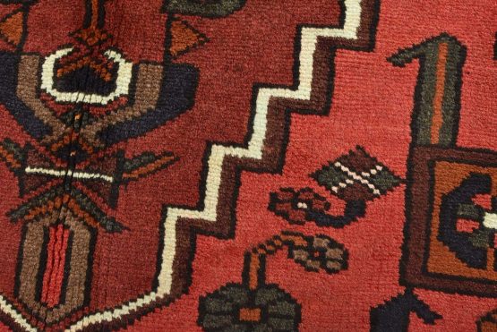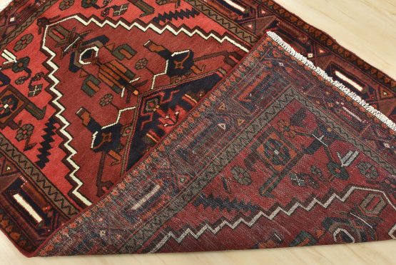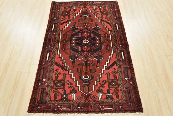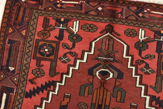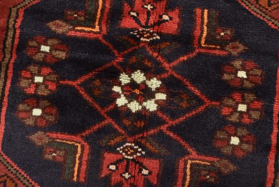 An authentic vintage tribal Hamedan rug hand-knotted with fine wool and natural dyes. This nomadic oriental rug features a central geometric medallion surrounded by geometric motifs set against a red background. It has a full wool pile with no worn areas and is in very good condition.