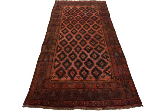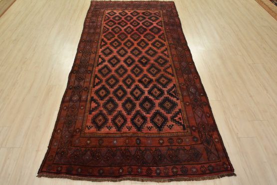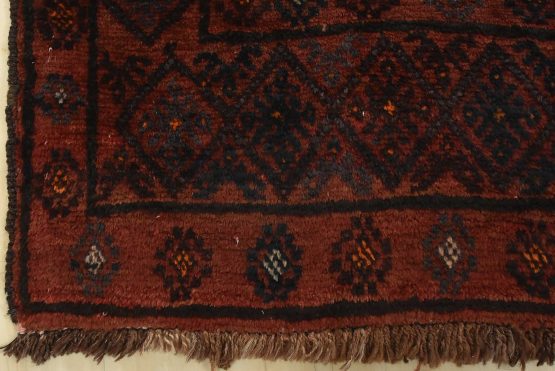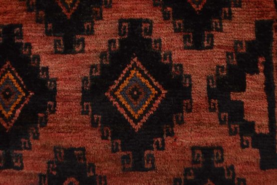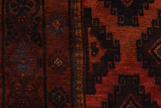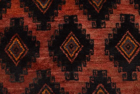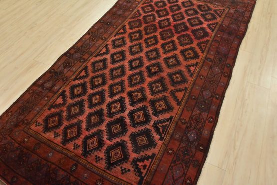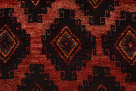 An authentic vintage tribal Baloch rug hand-knotted with fine wool and natural dyes. This rug features an all-over design with geometric motifs set against a red background. The wool pile shows some minor wear; please refer to the photos. Otherwise, the rug is in very good condition.