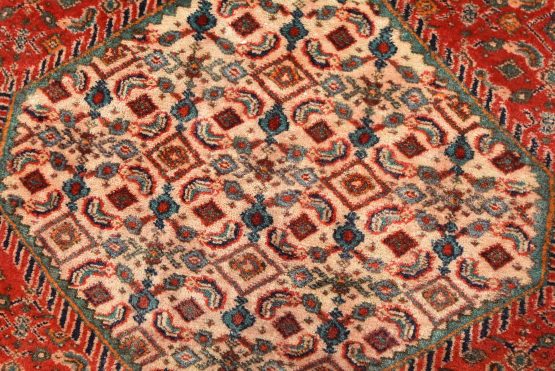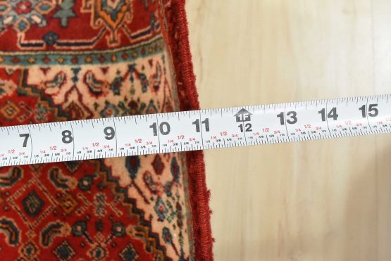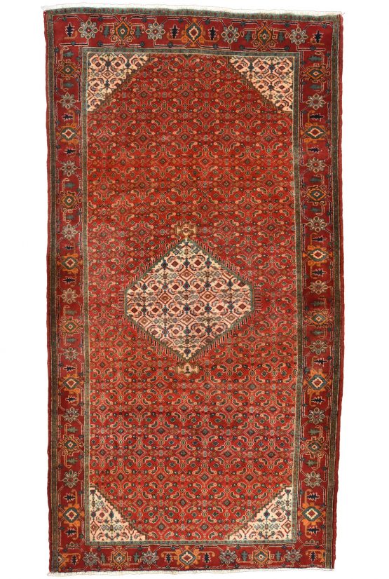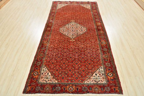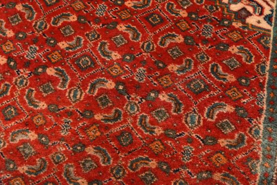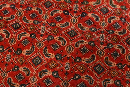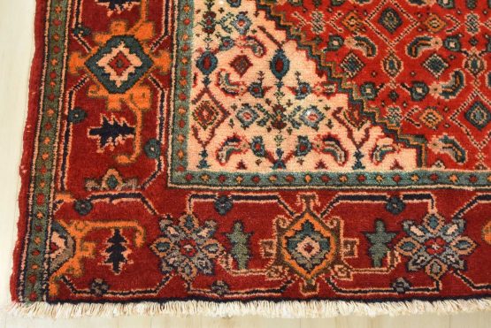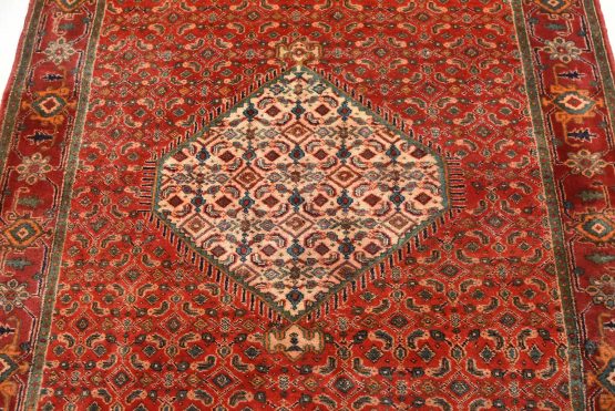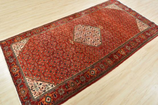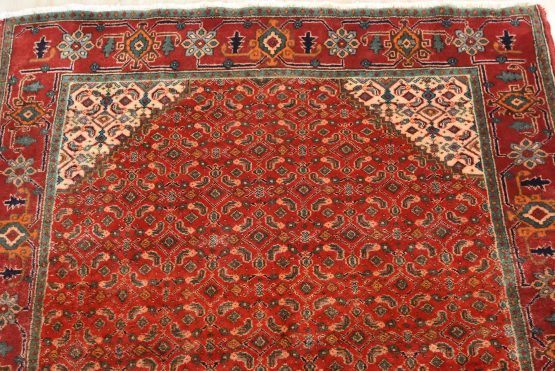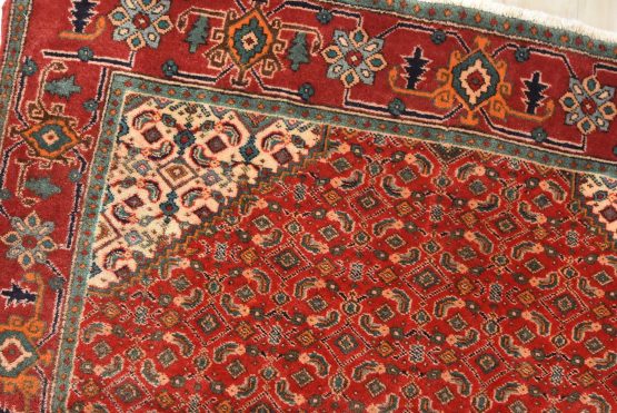 An authentic semi-antique tribal Bidjar rug hand-knotted with fine wool and natural dyes. This oriental rug features a central geometric medallion surrounded by a small-scale Herati pattern set against a red background. The wool pile does show some minor wear; please refer to the photos. Otherwise, this rug is in very good condition.