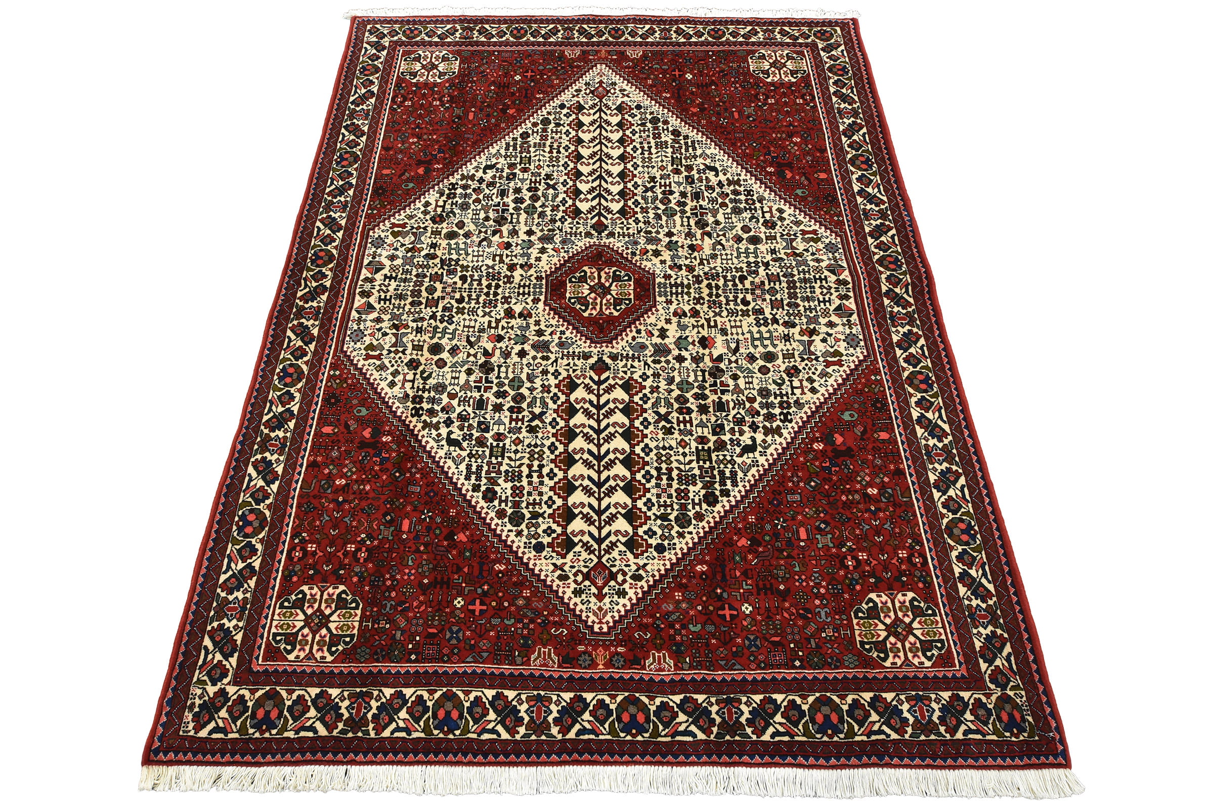 An authentic vintage tribal Abadeh rug hand-knotted with fine wool and natural dyes. This finely woven nomadic rug features a small central geometric medallion surrounded by smaller geometric motifs, including bird and animal figures. It has a full wool pile with no worn areas and is in very good condition.