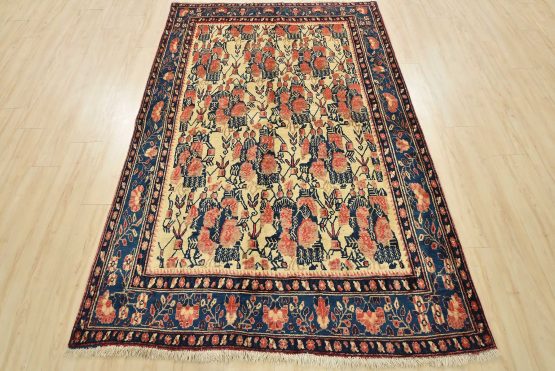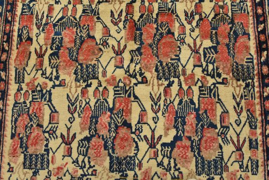 An authentic semi-antique, traditional Afshar rug hand-knotted with an all-wool pile on a cotton foundation. This oriental rug features an all-over floral pattern set against an ivory background. It has a full wool pile with no worn areas and is in very good condition.