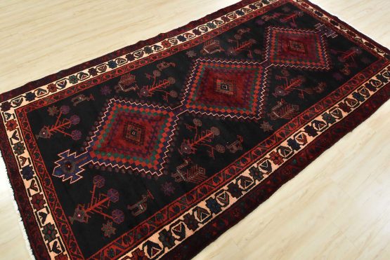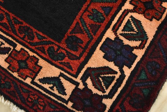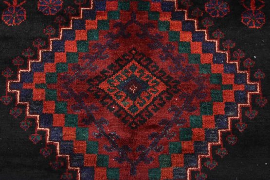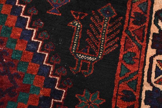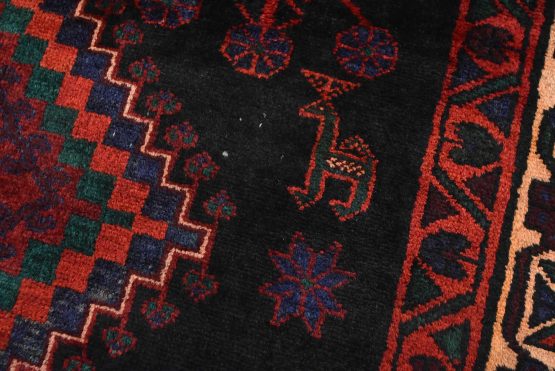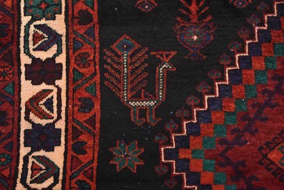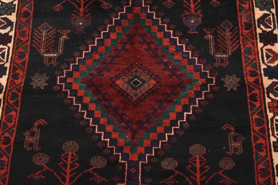 An authentic semi-antique tribal Hamedan rug hand-knotted with fine wool and natural dyes. This nomadic oriental rug features diamond-shaped medallions surrounded by geometric bird and animal figures set against a black background. The wool pile shows some minor wear, and some of the dyes have bled throughout the border; see photos. Otherwise, this rug is in very good condition.