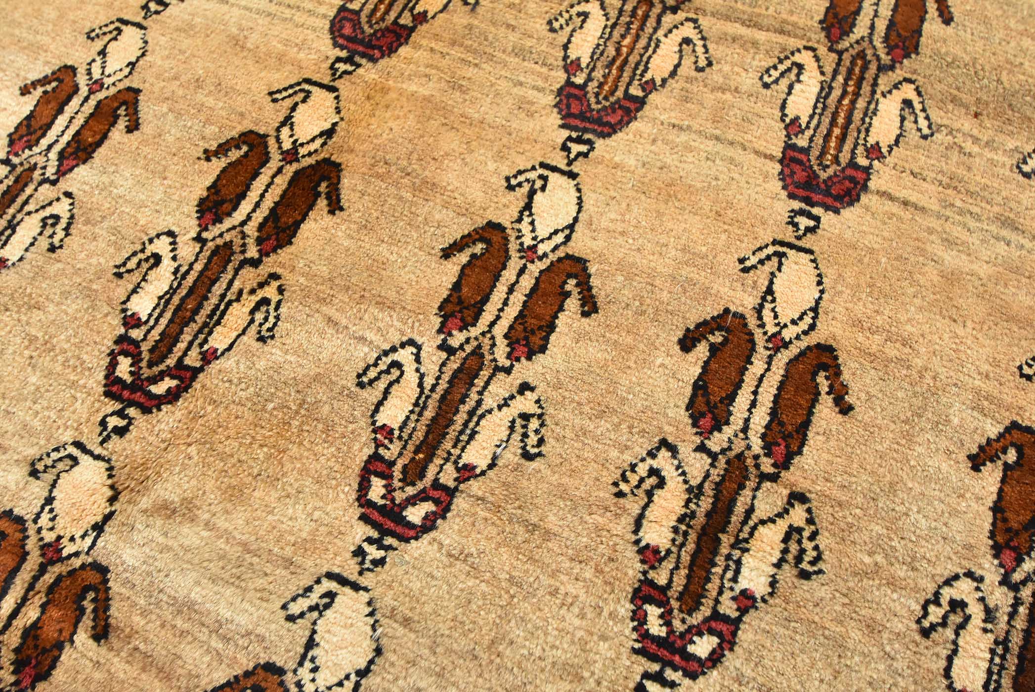 An authentic vintage tribal Gabbeh rug hand-knotted with fine wool and natural dyes. This nomadic oriental rug features an all-over pattern of geometric botanical motifs set against a beige background. There is a small area where the dyes have bled; please refer to the photos. Otherwise, the rug has a full wool pile and is in very good condition.