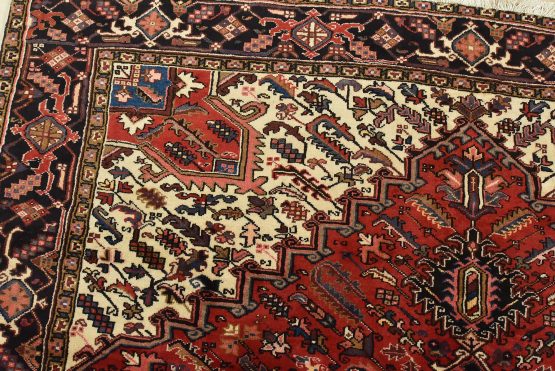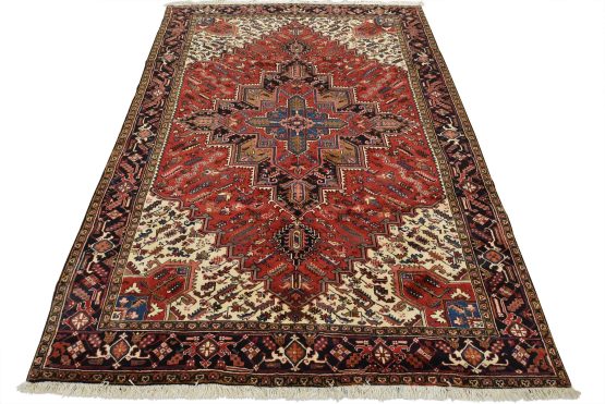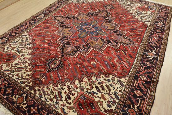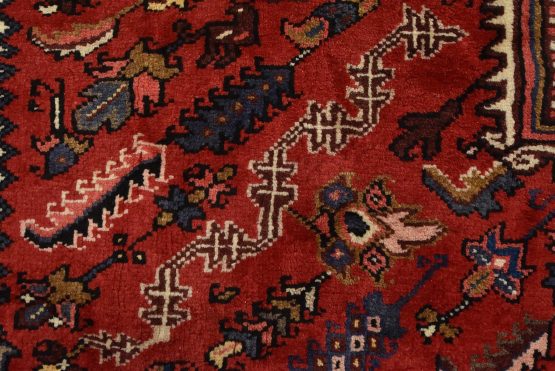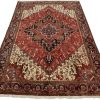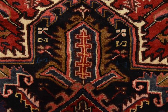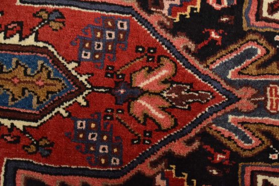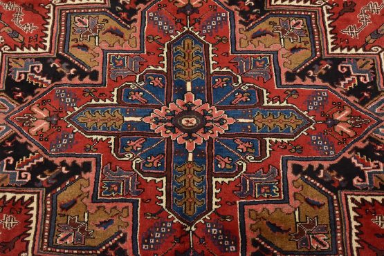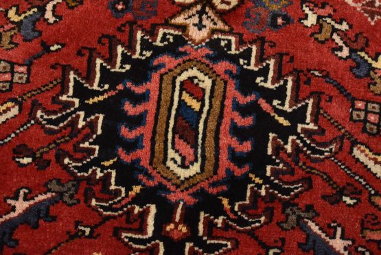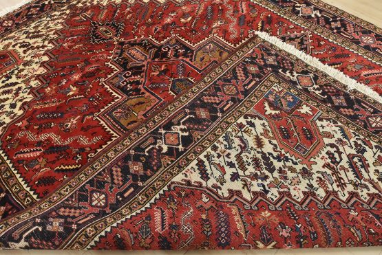 An authentic vintage traditional tribal Heriz rug hand-knotted with fine wool and natural dyes. This nomadic oriental rug features a central geometric medallion surrounded by geometric botanical designs set against a red background. It has a full wool pile with no worn areas and is in very good condition.