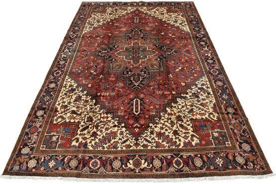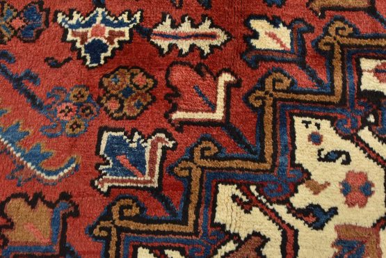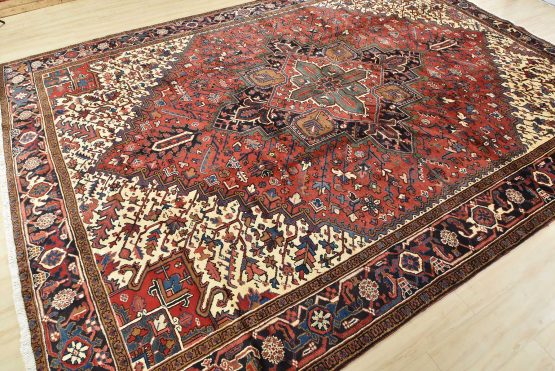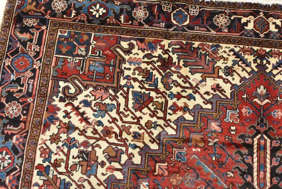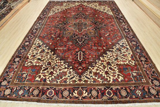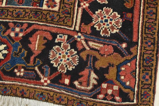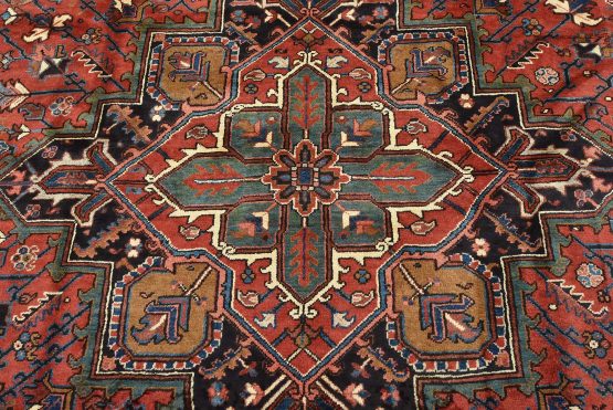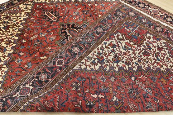An authentic vintage traditional tribal Heriz rug hand-knotted with fine wool and natural dyes. This oriental rug features a geometric central medallion surrounded by a geometric botanical pattern. It has a full wool pile with no worn areas and is in very good condition.
