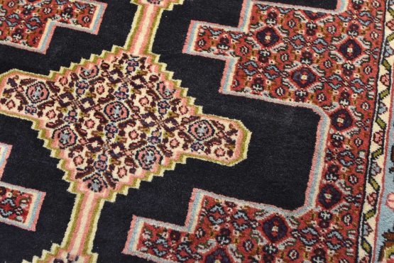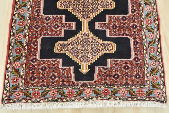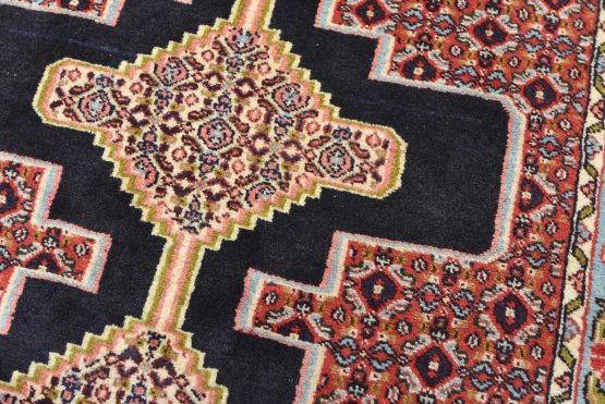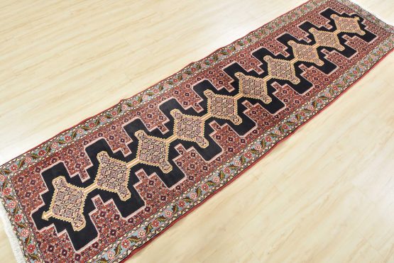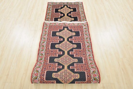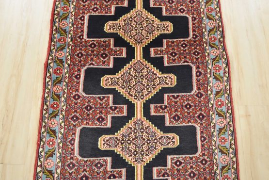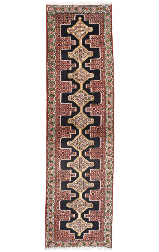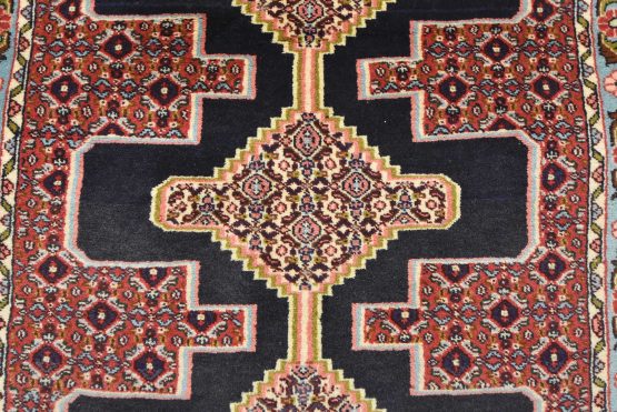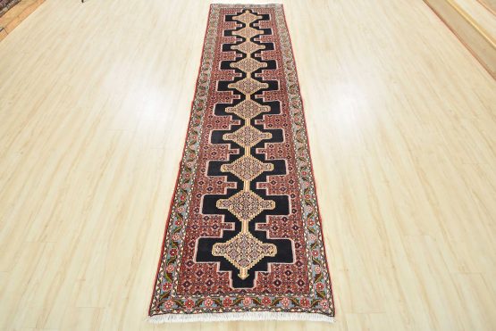 An authentic vintage traditional tribal Senneh runner hand-knotted with fine wool and natural dyes. This finely woven oriental rug features a row of geometric medallions surrounded by a small-scale geometric pattern. It has a full wool pile with no worn areas and is in very good condition.