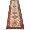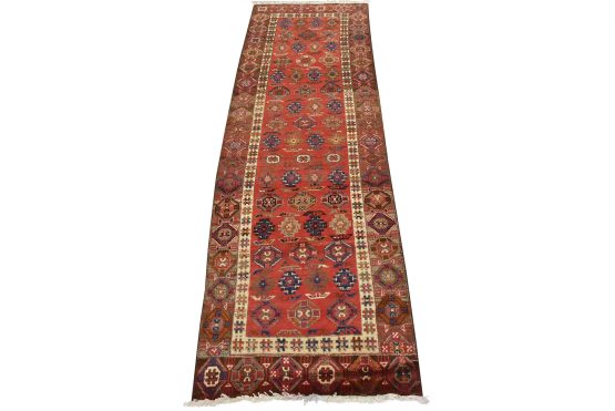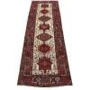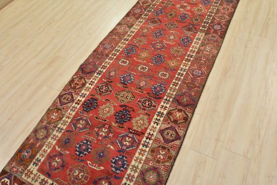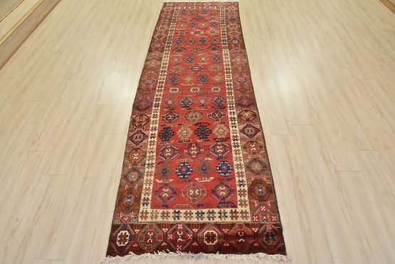 An authentic semi-antique tribal Meshkin runner hand-knotted with fine wool and natural dyes. This nomadic oriental rug features an all-over pattern of geometric motifs set against a red background. The wool pile shows some minimal wear; please refer to the photos. Otherwise, this rug is in very good condition.