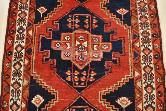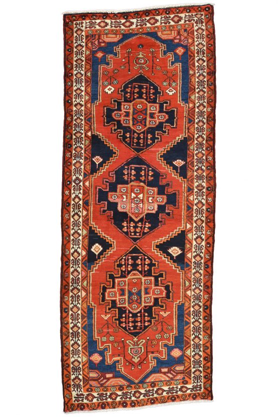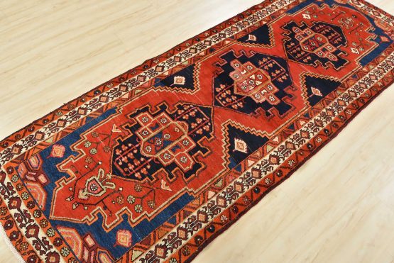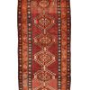 An authentic semi-antique tribal Sarab runner hand-knotted with fine wool and natural dyes. This nomadic oriental rug features geometric medallions set against a red background. The wool pile does show some minimal wear; please refer to the photos. Otherwise, this rug is in very good condition.