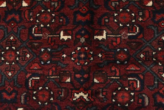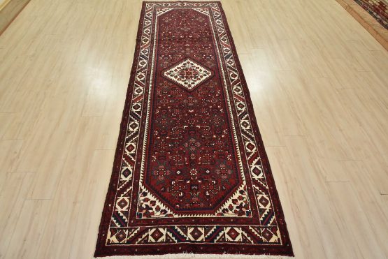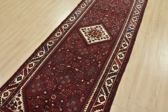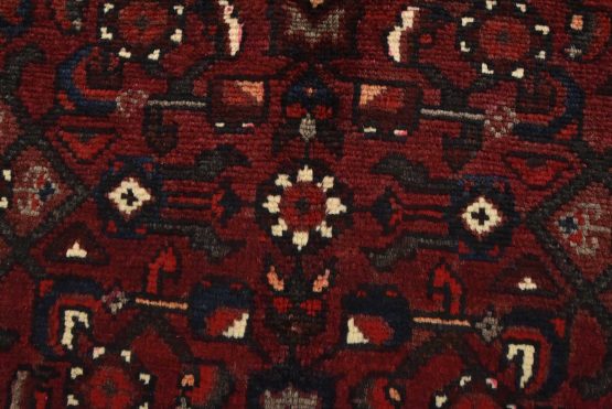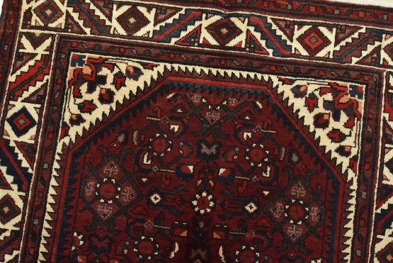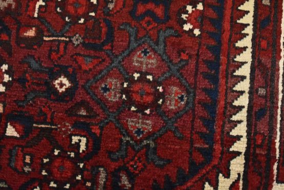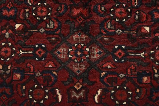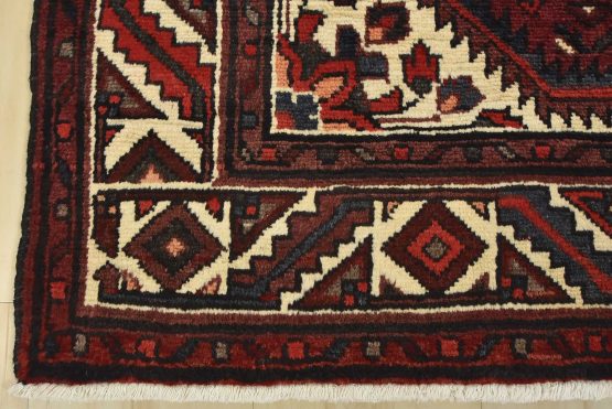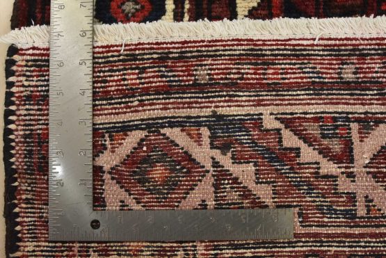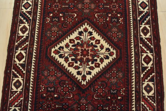 An authentic vintage traditional tribal Hamedan rug hand-knotted with fine wool and natural dyes. This oriental rug features a geometric central medallion surrounded by a Herati pattern. It has a full wool pile with no worn areas and is in very good condition.