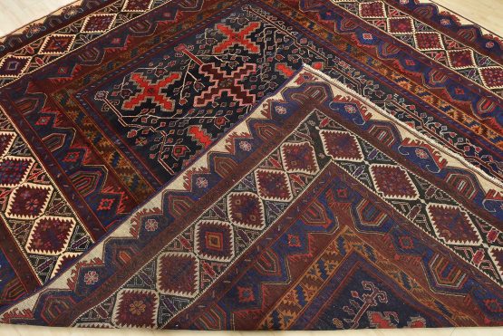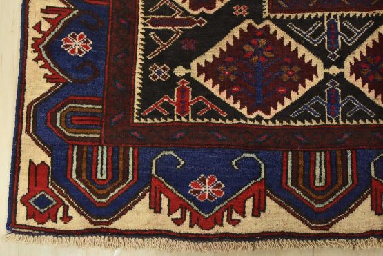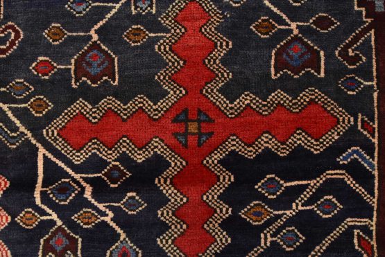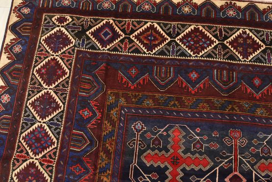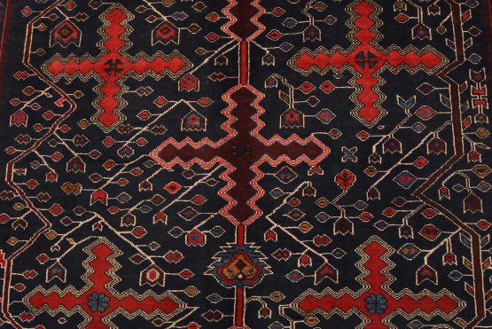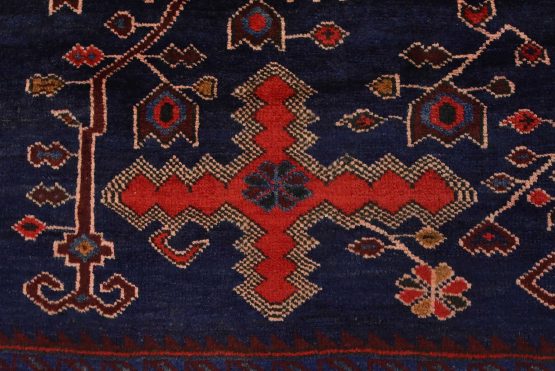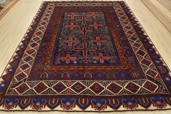 An authentic vintage tribal Baloch rug hand-knotted with fine wool and natural dyes. This nomadic oriental rug features an all-over design with crosses surrounded by geometric botanical motifs set against a dark blue background. It has a full wool pile with no worn areas and is in very good condition.