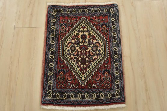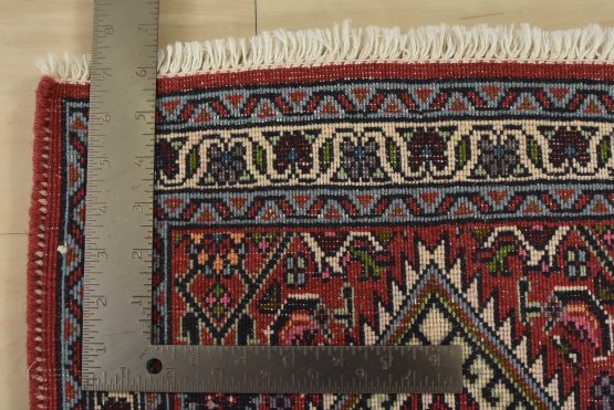 An authentic vintage traditional tribal Bidjar rug hand-knotted with fine wool and natural dyes. This finely woven oriental rug features a geometric medallion set against a red background. It has a full wool pile with no worn areas and is in very good condition.