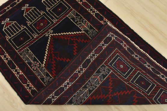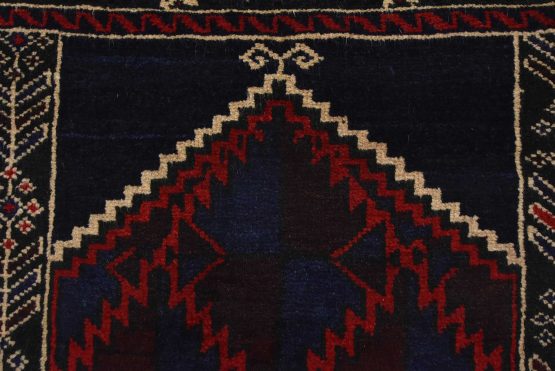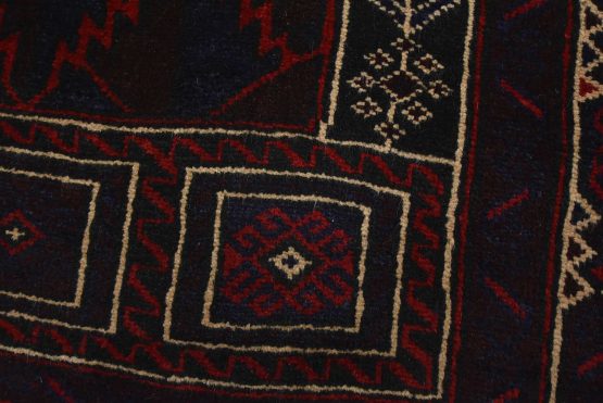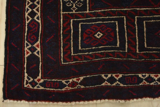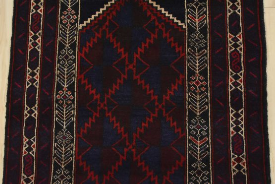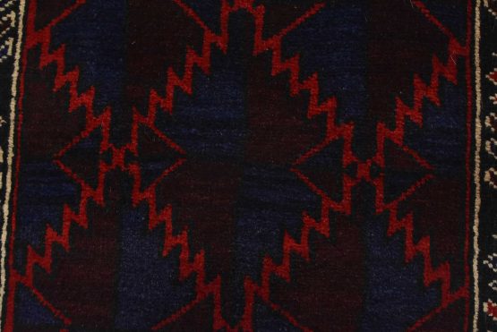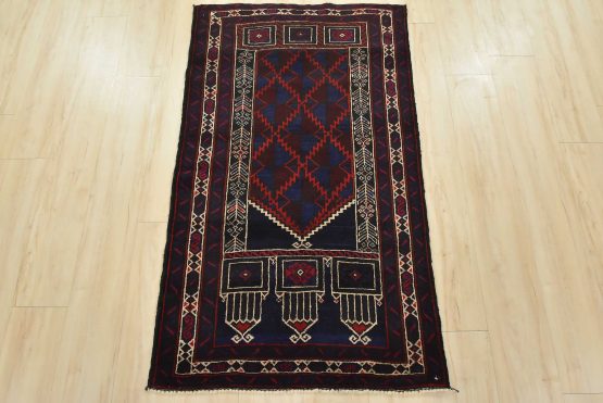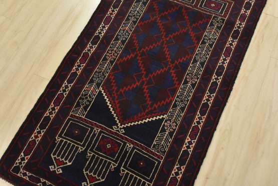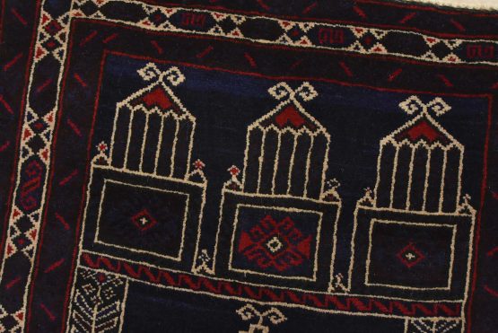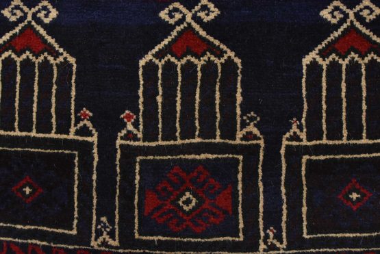An authentic vintage tribal Baloch rug hand-knotted with fine wool and natural dyes. This nomadic oriental prayer rug features an all-over geometric pattern set against a red background with small geometric minarets. It has a full wool pile with no worn areas and is in very good condition.