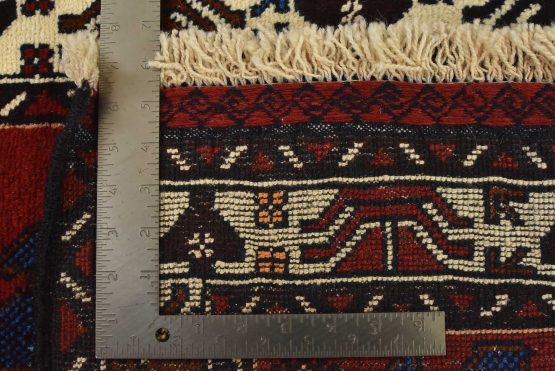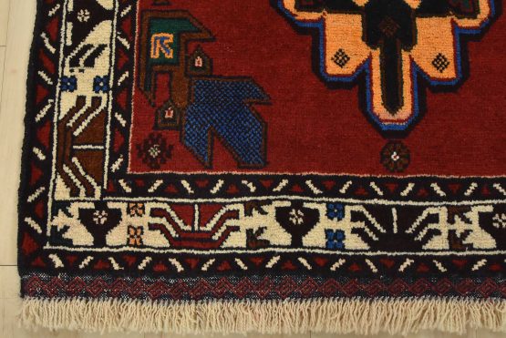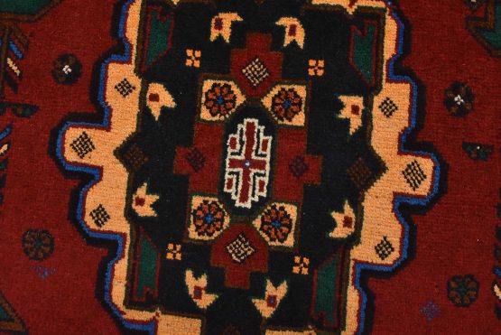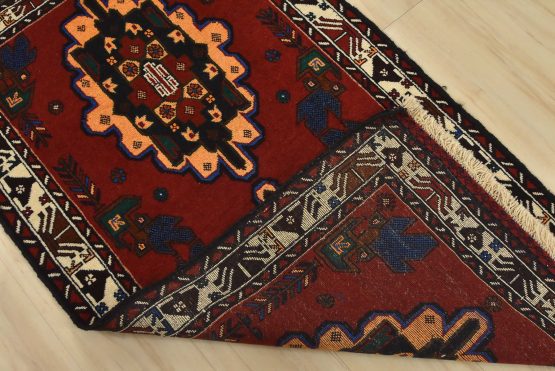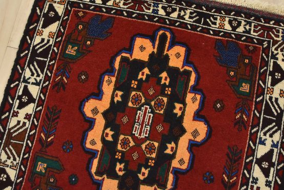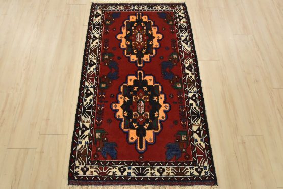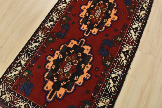 An authentic vintage tribal Baloch rug hand-knotted with fine wool and natural dyes. This nomadic oriental rug features two geometric medallions set against a red background. It has a full wool pile with no worn areas and is in very good condition.