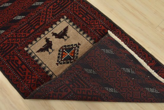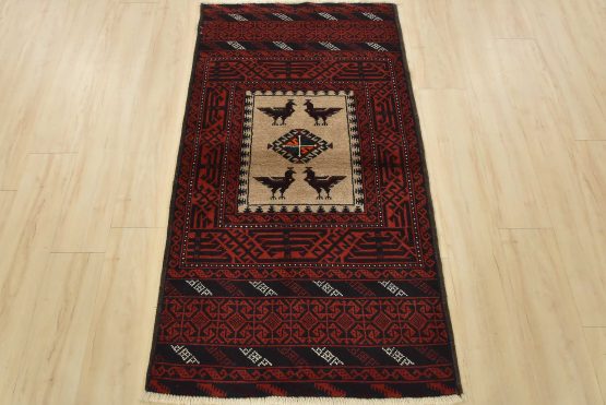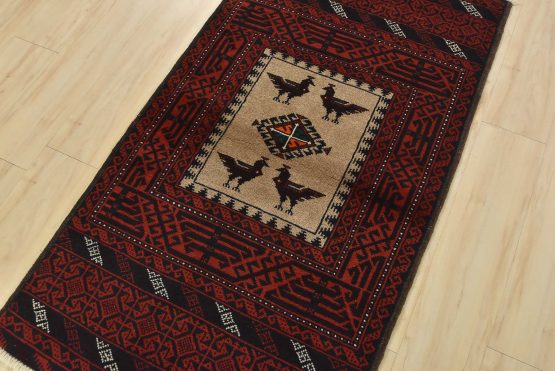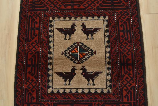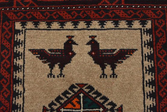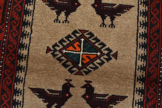 An authentic vintage tribal Baloch rug hand-knotted with fine wool and natural dyes. This nomadic oriental rug features a geometric central medallion surrounded by geometric birds set against a gray background. It has a full wool pile with no worn areas and is in very good condition.