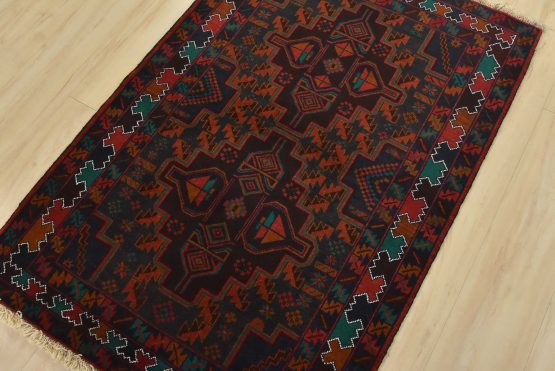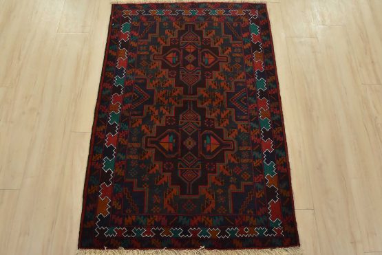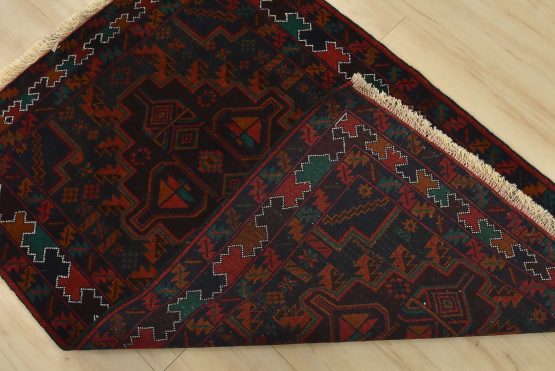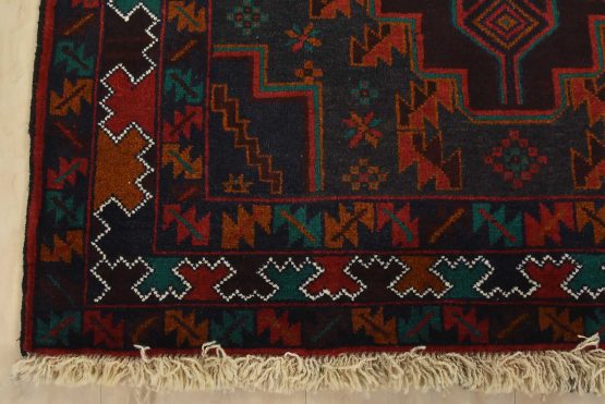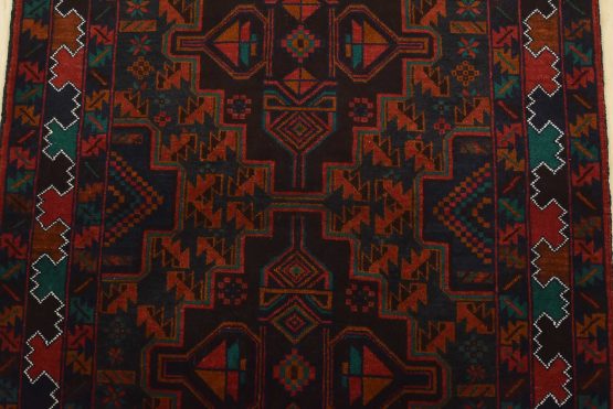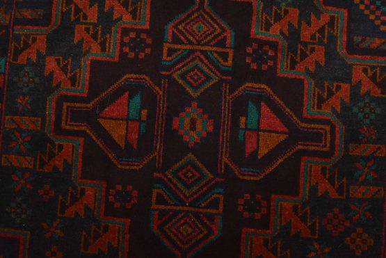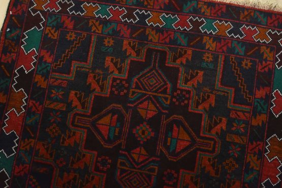 An authentic vintage tribal Baloch rug hand-knotted with fine wool and natural dyes. This nomadic oriental rug features two geometric medallions surrounded by other geometric motifs set against a dark blue background. It has a full wool pile with no worn areas and is in very good condition.