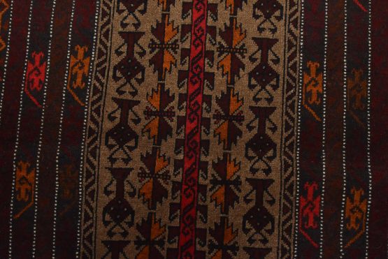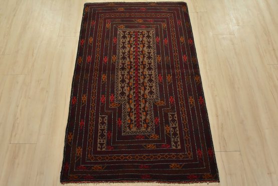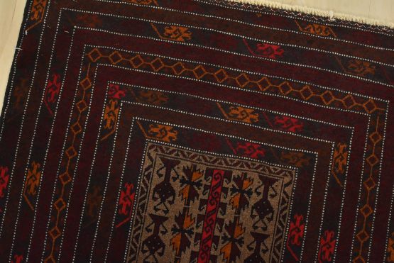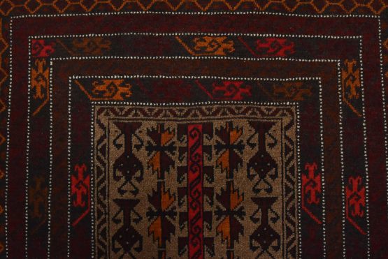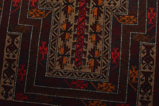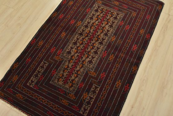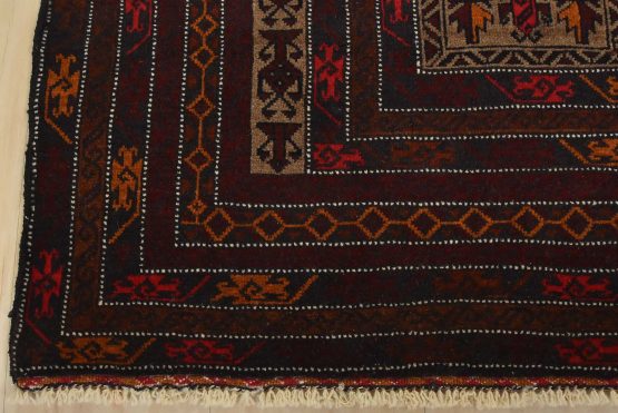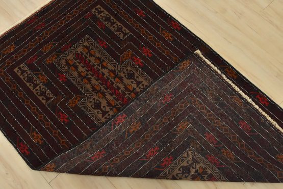 An authentic vintage tribal Baloch prayer rug hand-knotted with fine wool and natural dyes. This nomadic oriental rug features an all-over design with geometric motifs set against a brown background. It has a full wool pile with no worn areas and is in very good condition.