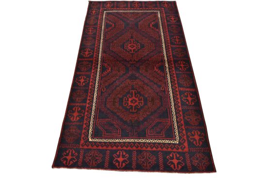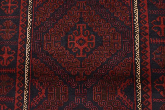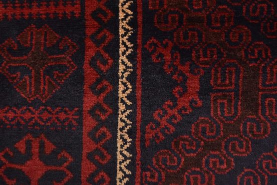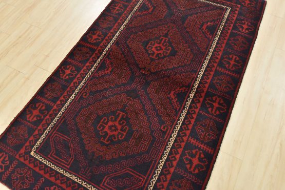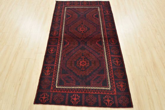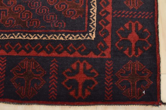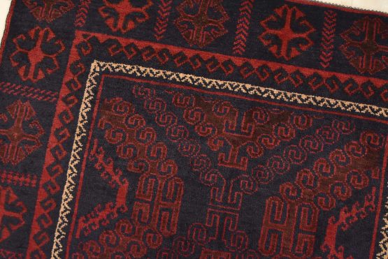 An authentic vintage tribal Baloch rug hand-knotted with fine wool and natural dyes. This nomadic oriental rug features two geometric medallions set against a dark blue background. The edge shows some minor wear; see photos. Otherwise, this rug has a full wool pile and is in very good condition.