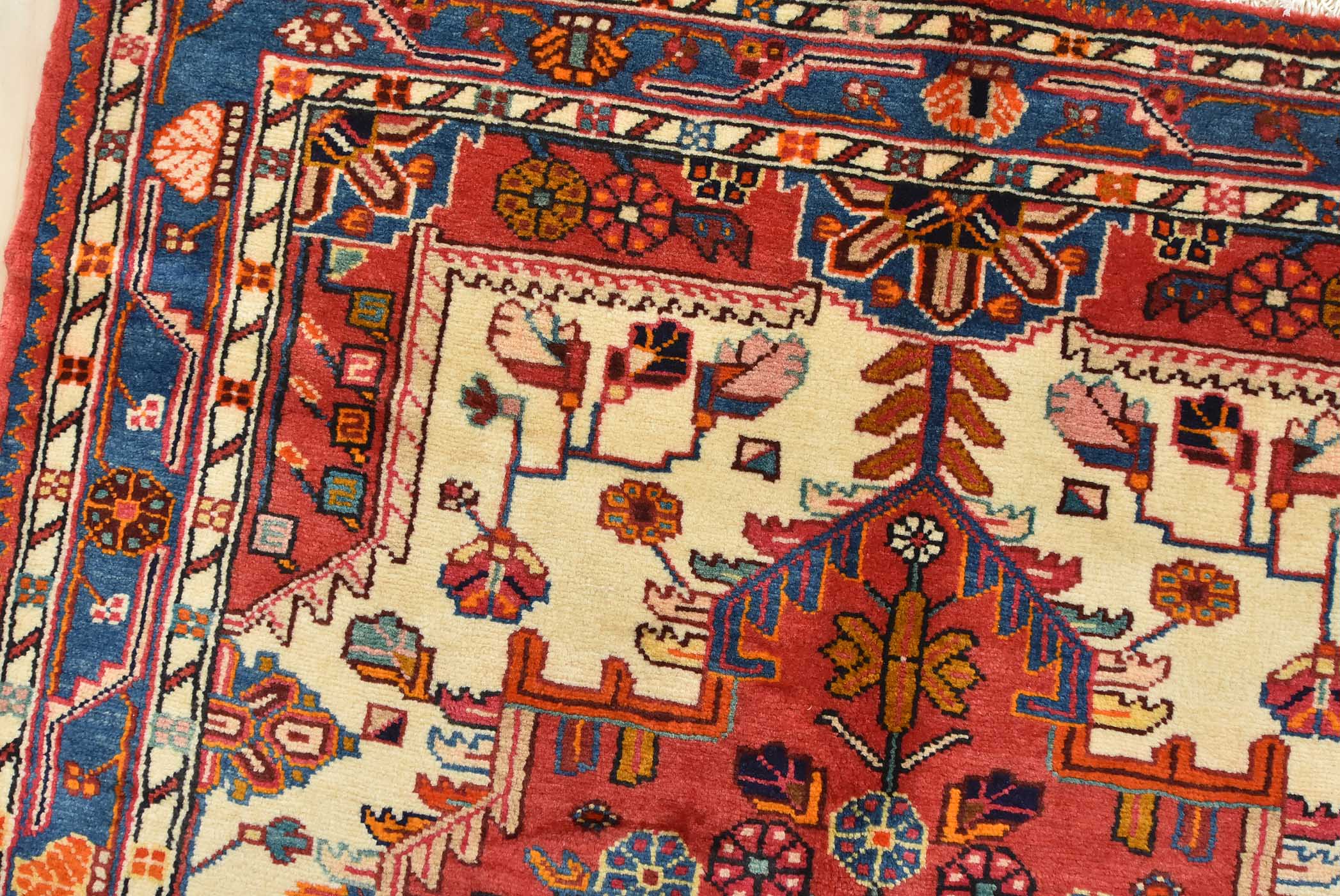 An authentic vintage tribal Zanjan rug hand-knotted with fine wool and natural dyes. This nomadic oriental rug features a central geometric medallion surrounded by geometric botanical motifs set against an ivory background. It has a full wool pile with no worn areas and is in very good condition.