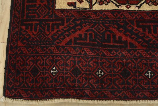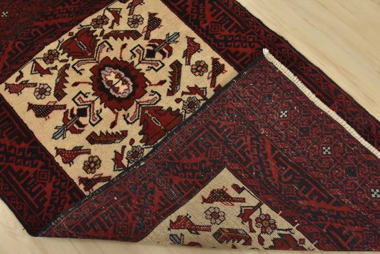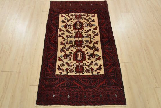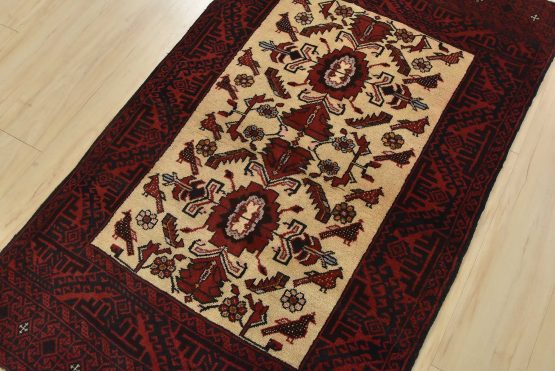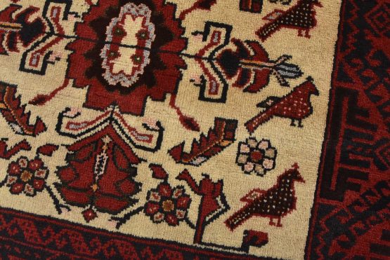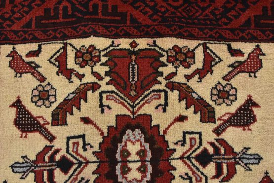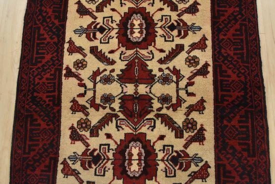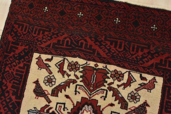 An authentic vintage tribal Baloch rug hand-knotted with fine wool and natural dyes. This nomadic oriental rug features an all-over geometric botanical design with geometric bird figures set against an ivory background. It has a full wool pile with no worn areas and is in very good condition.